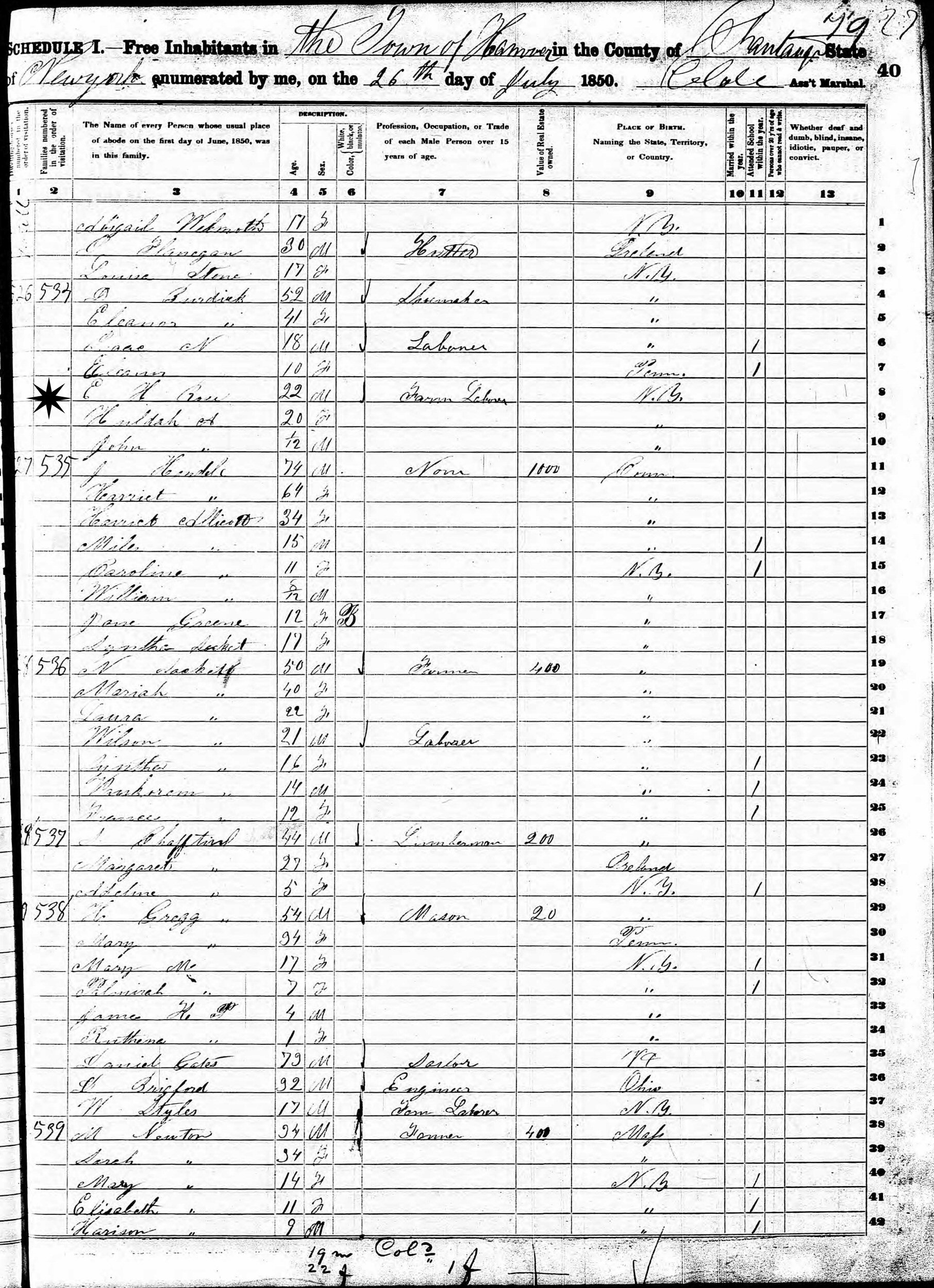 July 26, 1850 - Hanover, Chautauqua County, New York (w/in-laws).