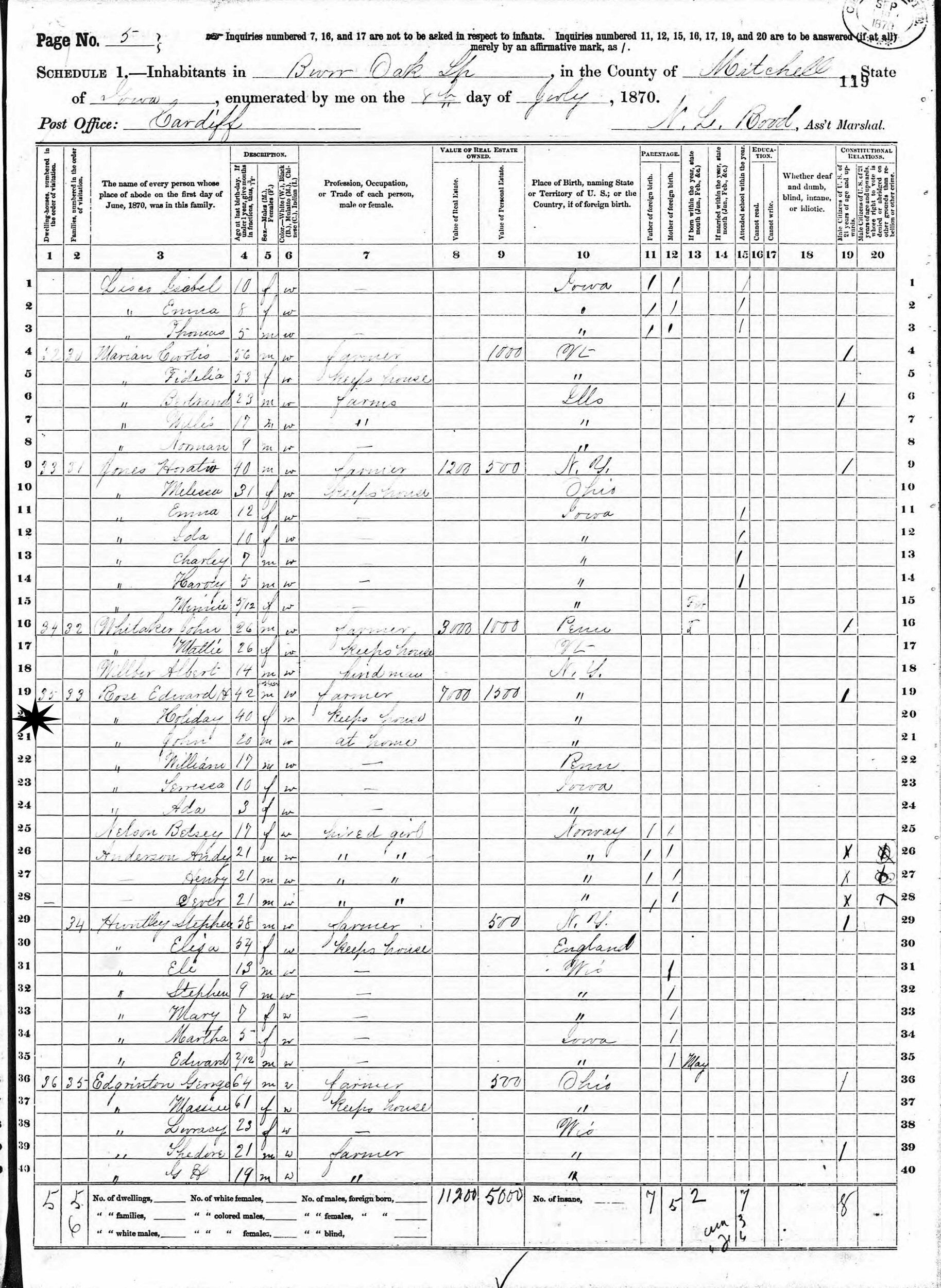July 8, 1870 - Burr Oak Township, Cardiff, Mitchell County, Iowa.