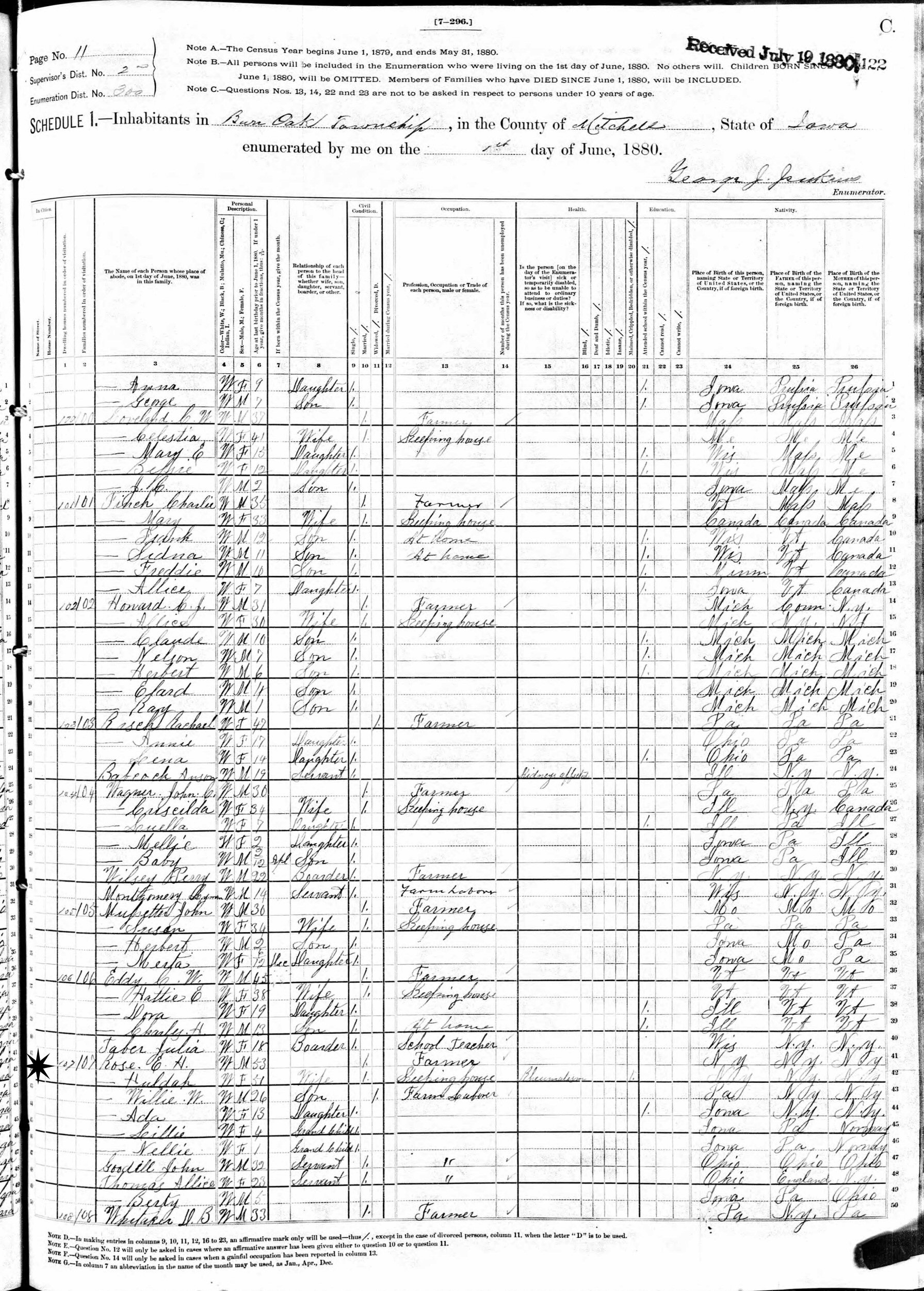 June 1, 1880 - Supervisor's District 2, Enumeration District 300, Burr Oak Township, Mitchell County, Iowa.