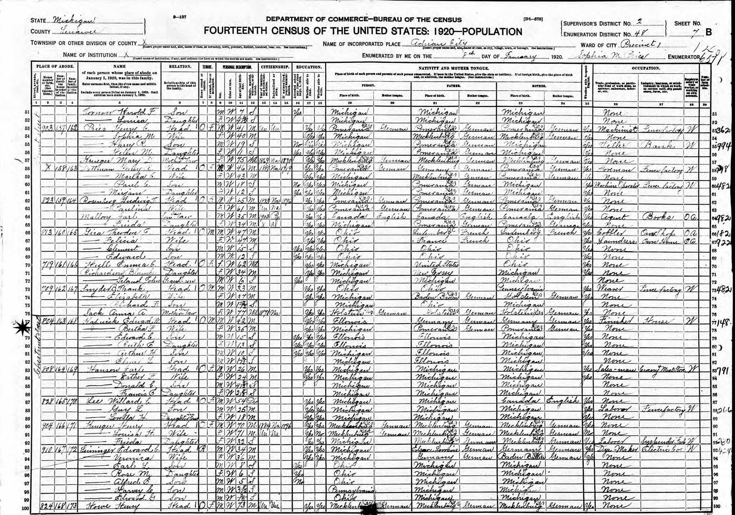 February 8, 1920 - 804 Chestnut Street, Precinct 1, Supervisor's District 2, Enumeration District 48, Adrian, Lenawee County, Michigan.