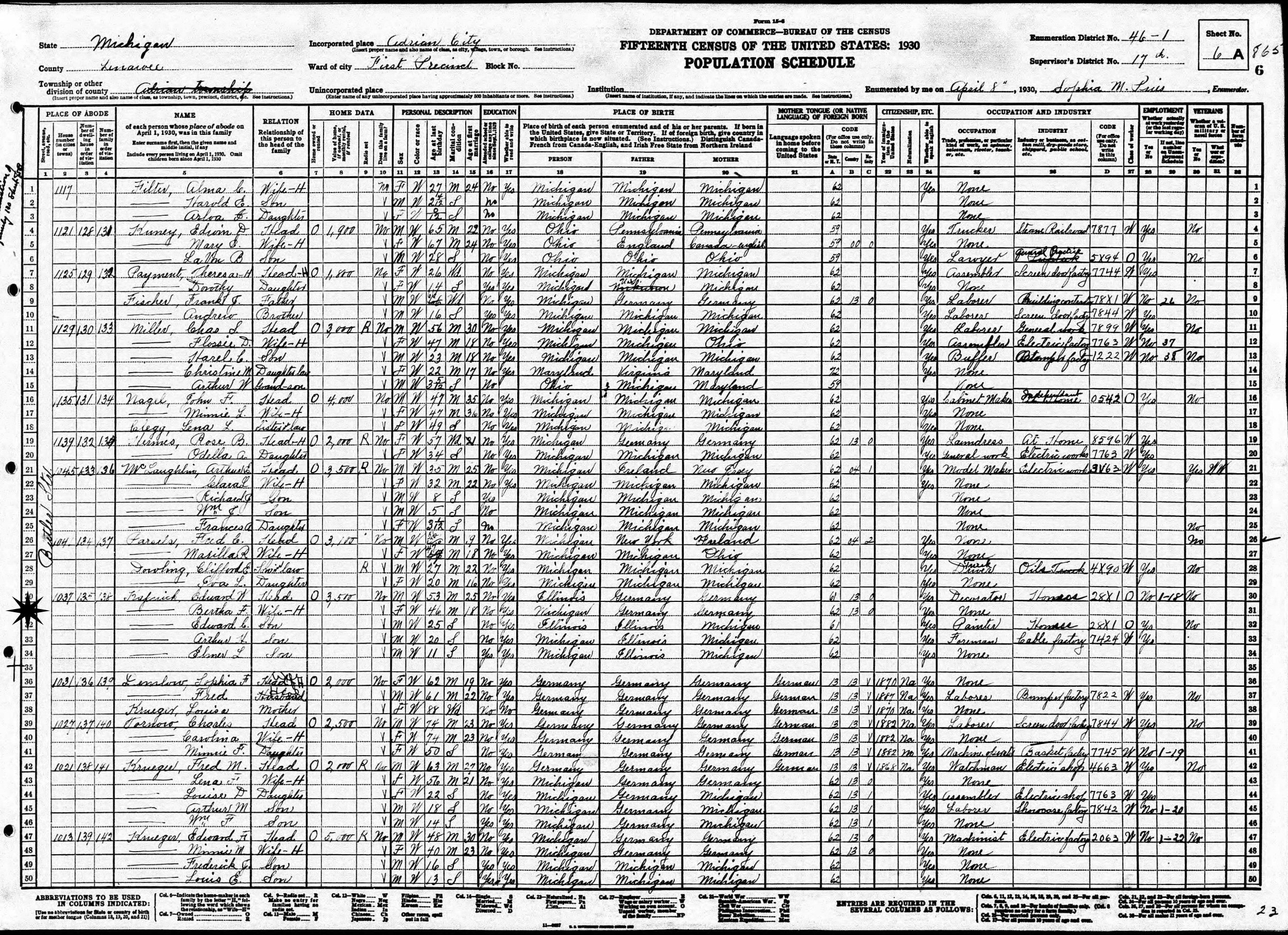 April 8, 1930 - 1037 Butler Street, Precinct 1, Supervisor's District 17, Enumeration District 46-1, Adrian, Lenawee County, Michigan.