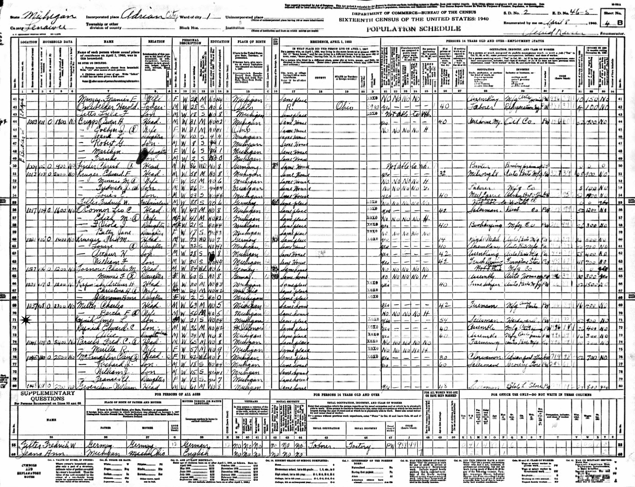 April 8, 1940 - 1037 E Butler Street, Supervisor's District 2, Enumeration District 46-5, Adrian, Lenawee County, Michigan.