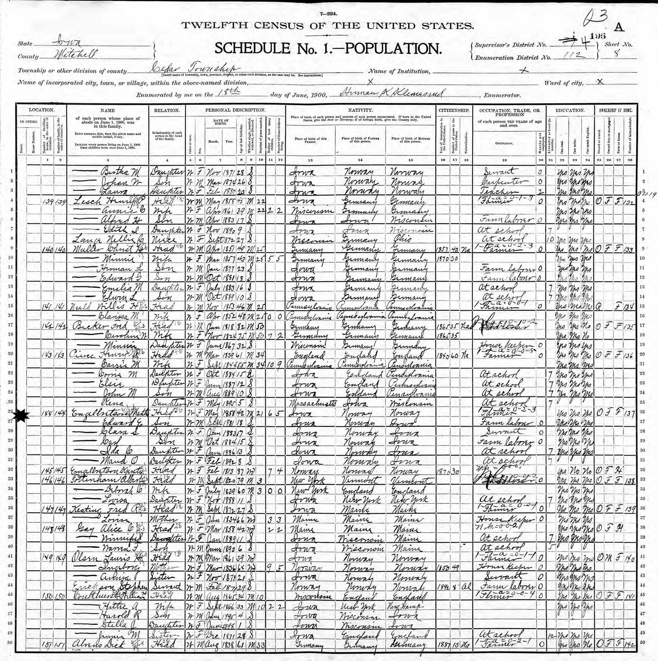 June 18, 1900 - Supervisor's District 4, Enumeration District 112, Cedar Township, Mitchell County, Iowa.