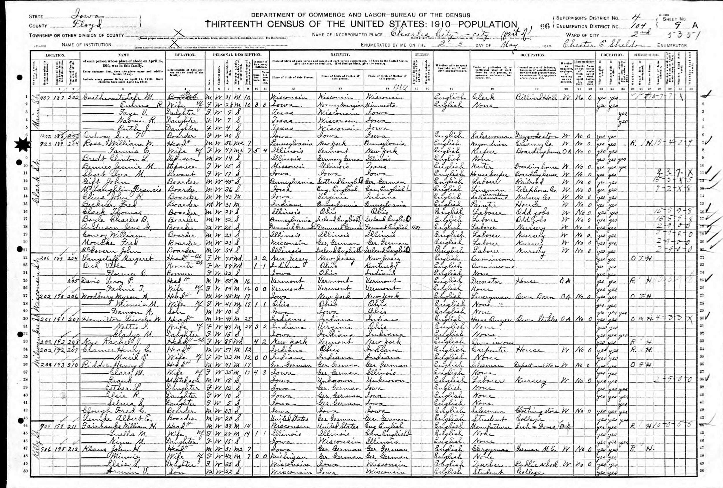 May 2-3, 1910 - 922 Clark Street, Ward 2, Supervisor's District 4, Enumeration District 104, Charles City, Floyd County, Iowa.