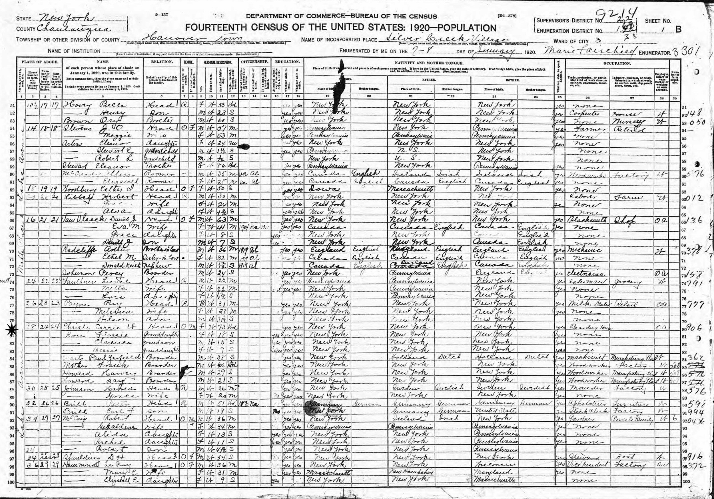 January 6-7, 1920 - 28 Lake Avenue, Ward 3, Supervisor's District 22, Enumeration District 133, Silver Creek Village, Hanover Town, Chautauqua County, New York (w/Maternal Grandmother).