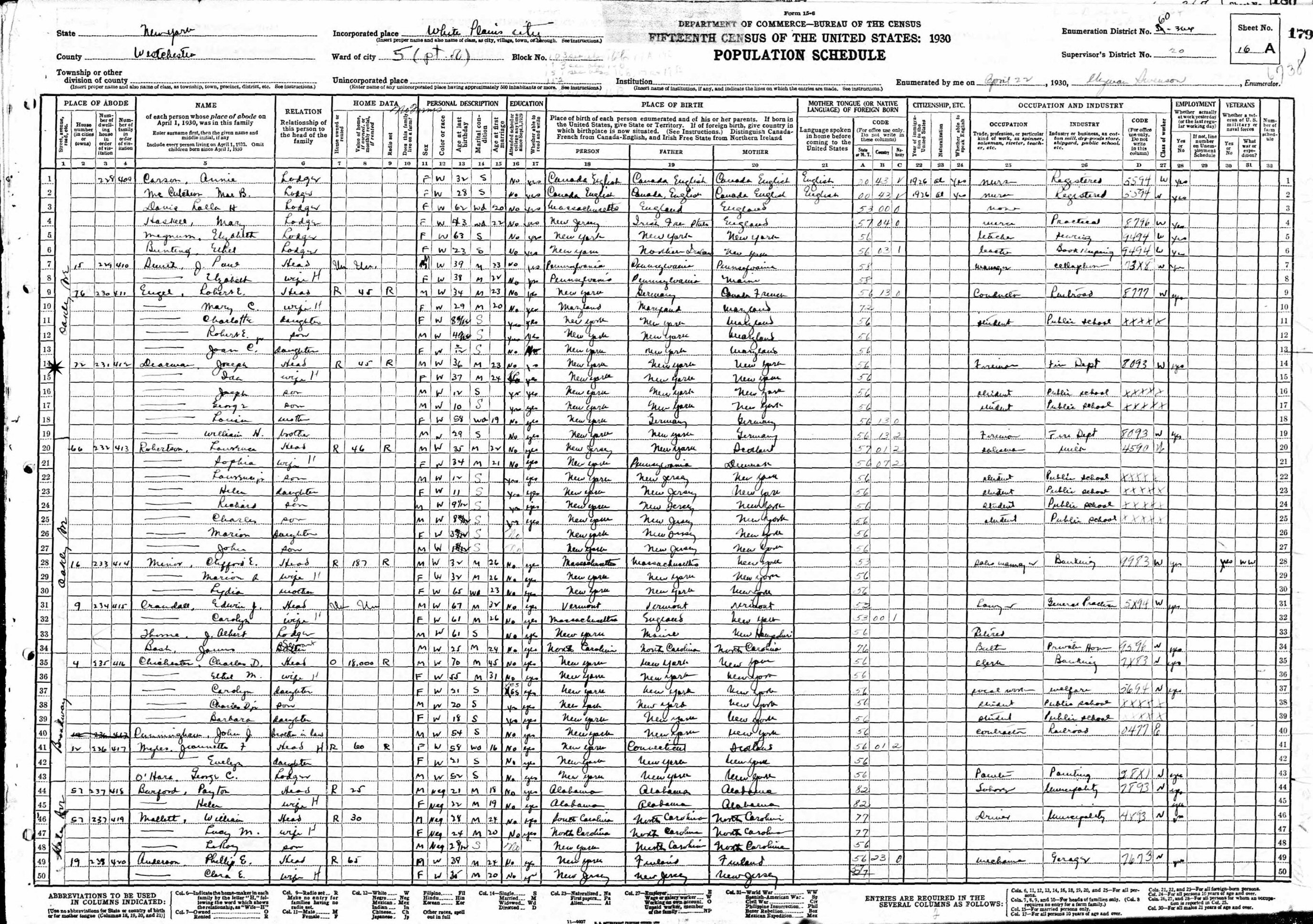 April 22, 1930 - 72 Oakley Avenue, Ward 5, Supervisor's District 20, Enumeration District 60-364, White Plains, Westchester County, New York.