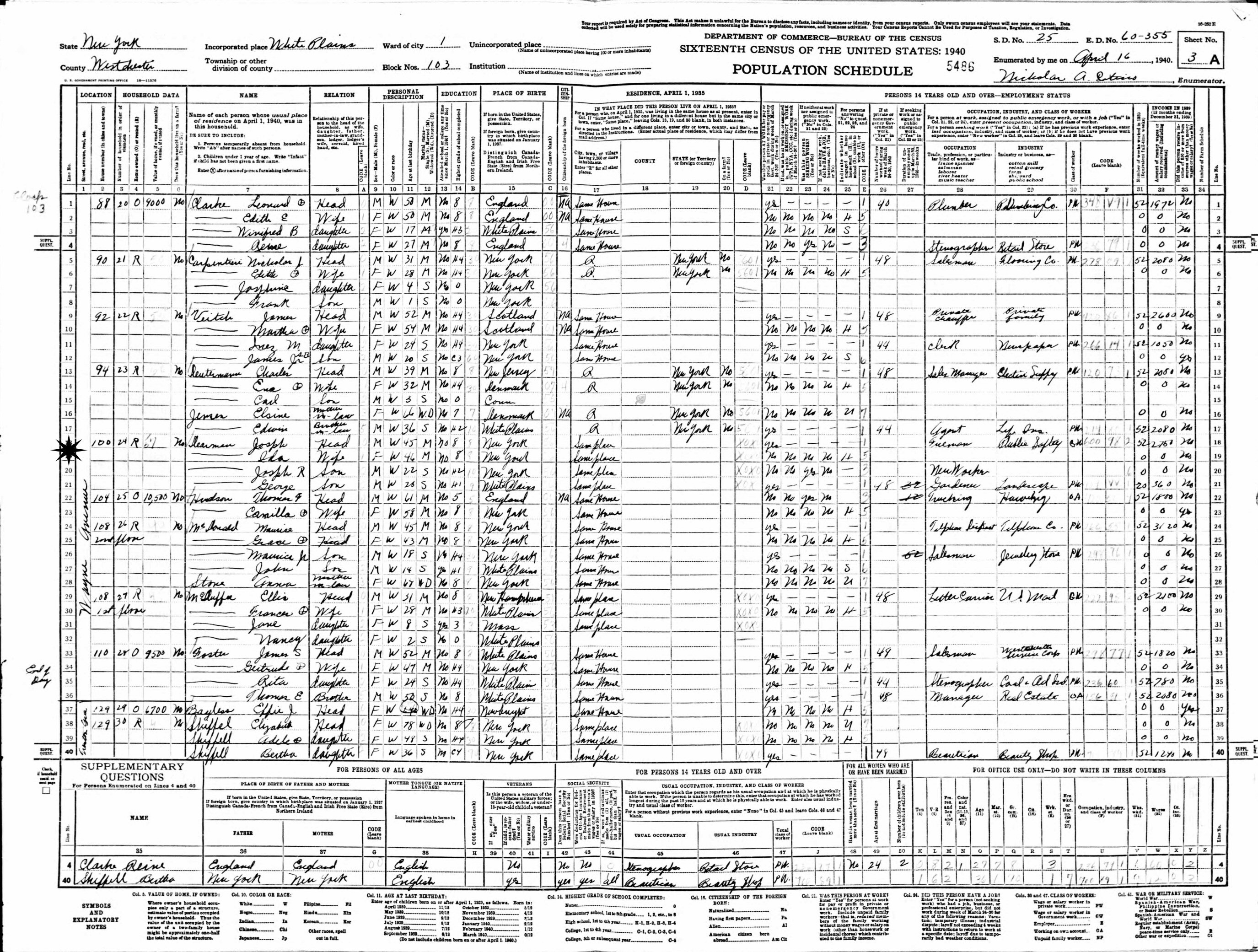 April 16, 1940 - 100 Wayne Avenue, Ward 1, Block 103, Supervisor's District 25, Enumeration District 60-355, White Plains, Westchester County, New York.