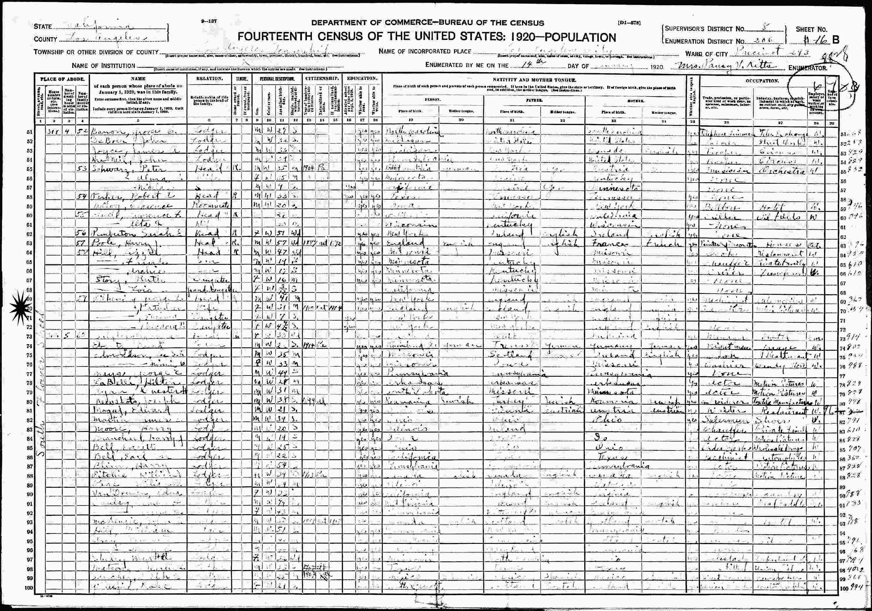 1920 - Assembly District 64, Enumeration District 206, Precinct 293, 318 South Flower Street, Los Angeles, Los Angeles County, California.