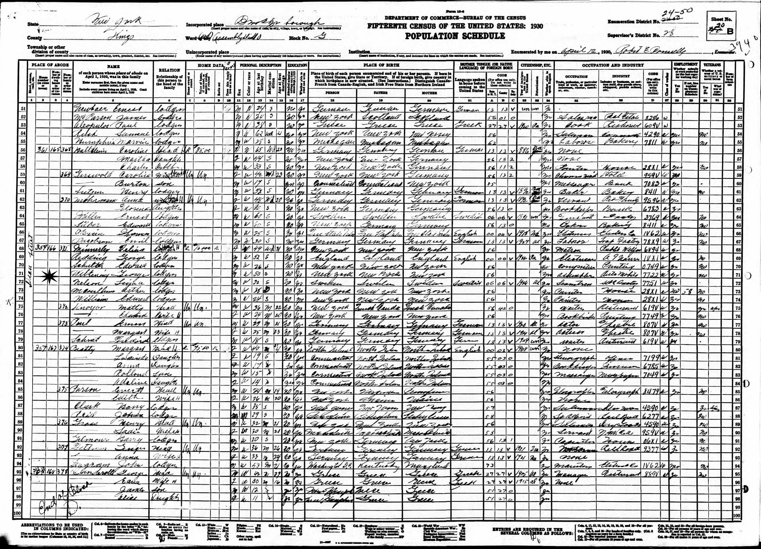 April 12, 1930 - 359 Dean Street, Assembly District 10, Block G, Supervisor's District 28, Enumeration District 24-50, Brooklyn, Kings County, New York (Lodger).