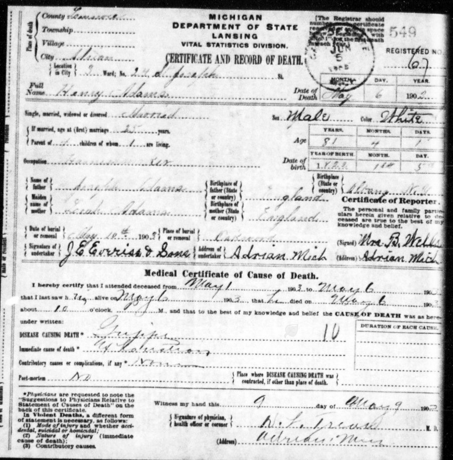Died: May 6, 1903 in Adrian, Lenawee County, Michigan.