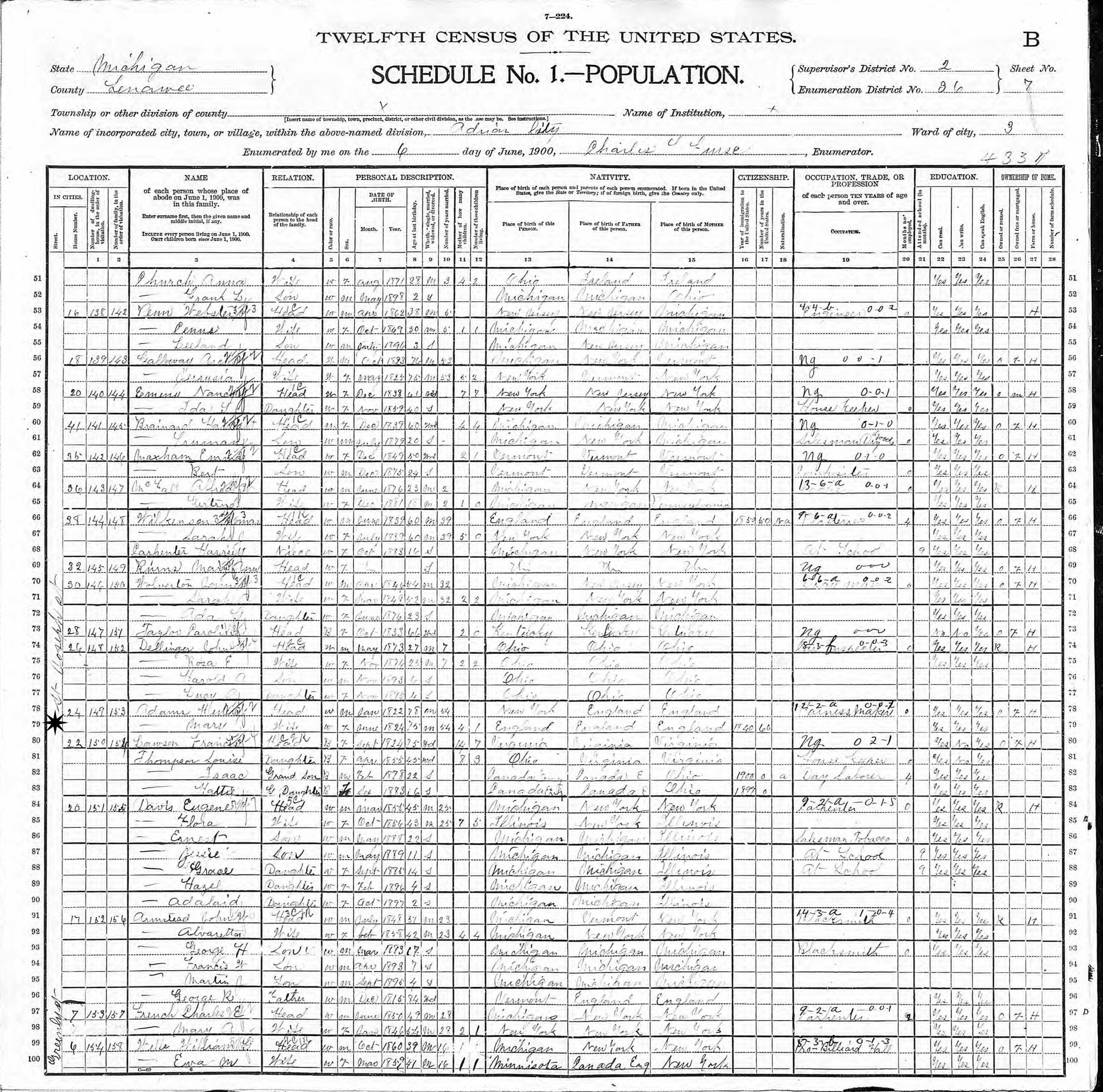 June 6, 1900 - 24 St. Joseph Street, Ward 3, Supervisor's District 2, Enumeration District 36, Adrian, Lenawee County, Michigan.