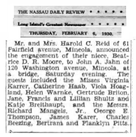 Married: Beatrice Dorothy Rose Moore August 9, 1930 in Nassau County, New York. (Certificate #A7438.)