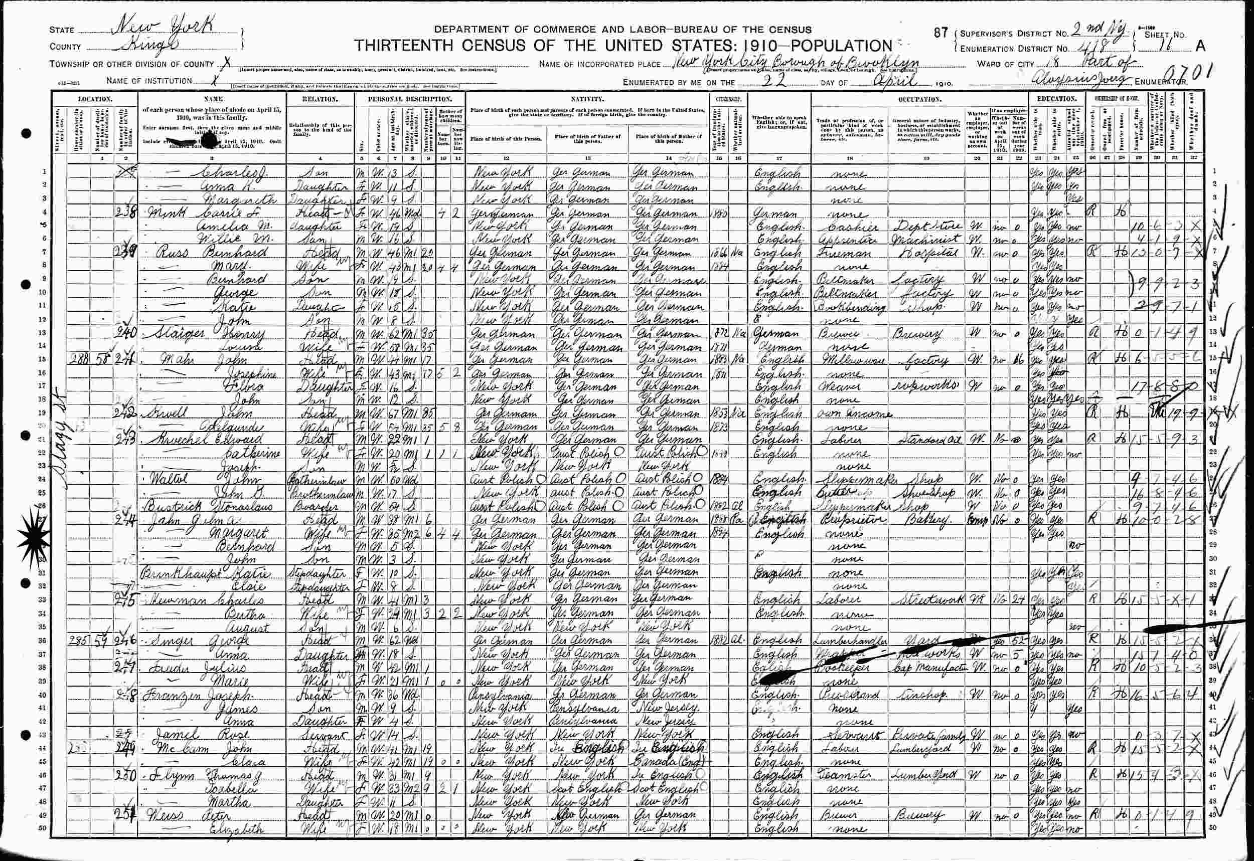 April 22, 1910 - 83 Stagg Street, Ward 18, Supervisor's District 2, Enumeration District 418, Brooklyn, Kings County, New York.