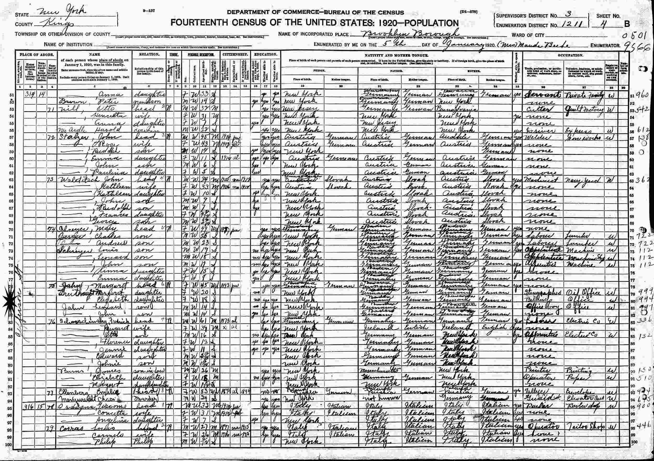 January 5, 1920 - 315 Jefferson Street, Supervisor's District 3, Enumeration District 1211, Brooklyn, Kings County, New York.