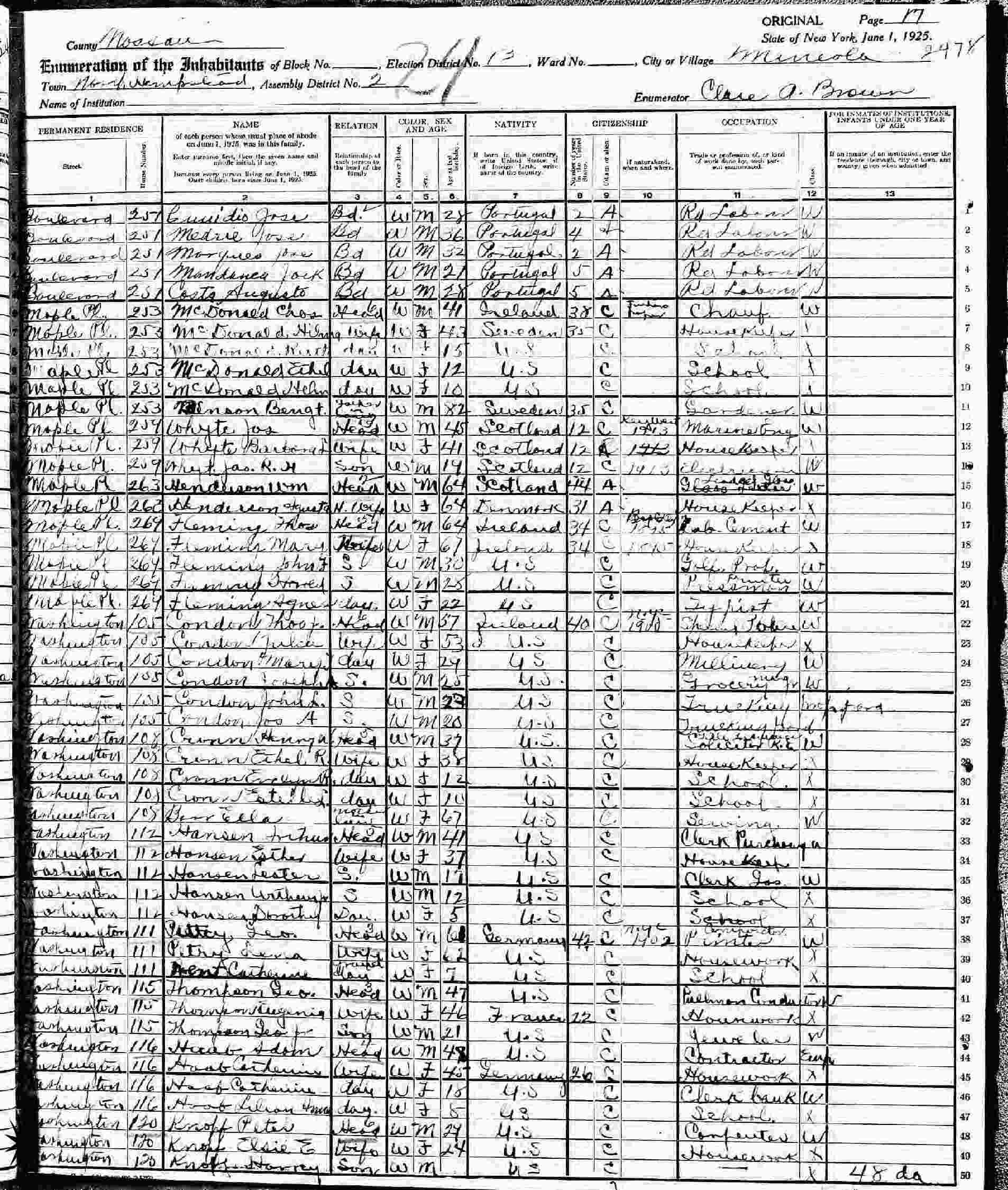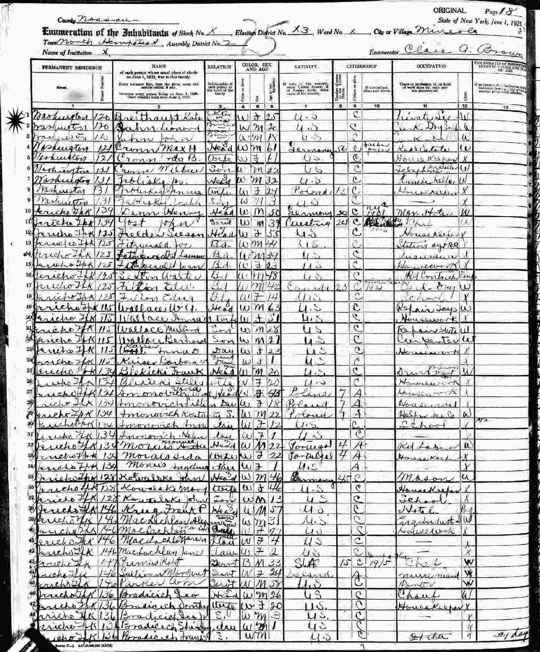 June 1, 1925 - 120 Washington, Assembly District 2, Election District 13, Mineola, North Hempstead, Nassau County, New York (Living with half-sister and brother-in-law, Peter and Elsie Knopf.)
