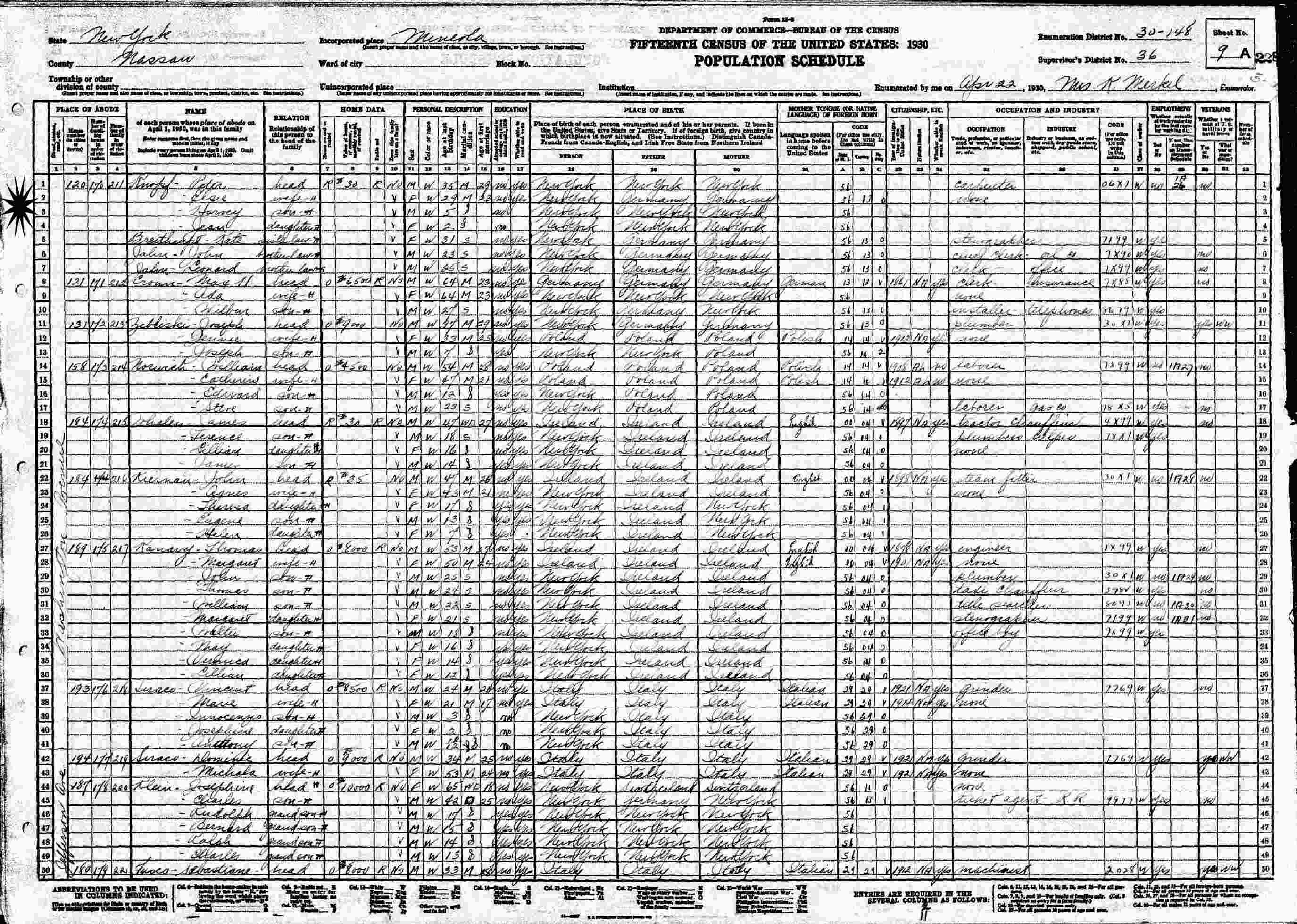April 22, 1930 - 120 Washington Avenue, Supervisor's District 36, Enumeration District 30-148, Mineola, North Hempstead, Nassau County, New York. (Living with half-sister and brother-in-law, Peter and Elsie Knopf.)