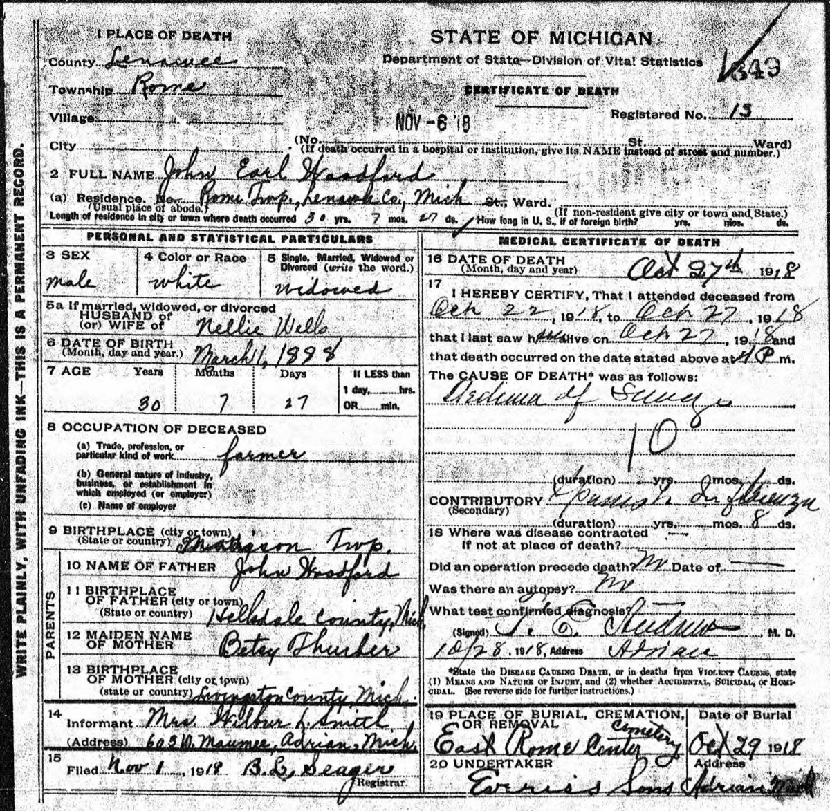 Died: October 27, 1918 in Rome, Lenawee County, Michigan.