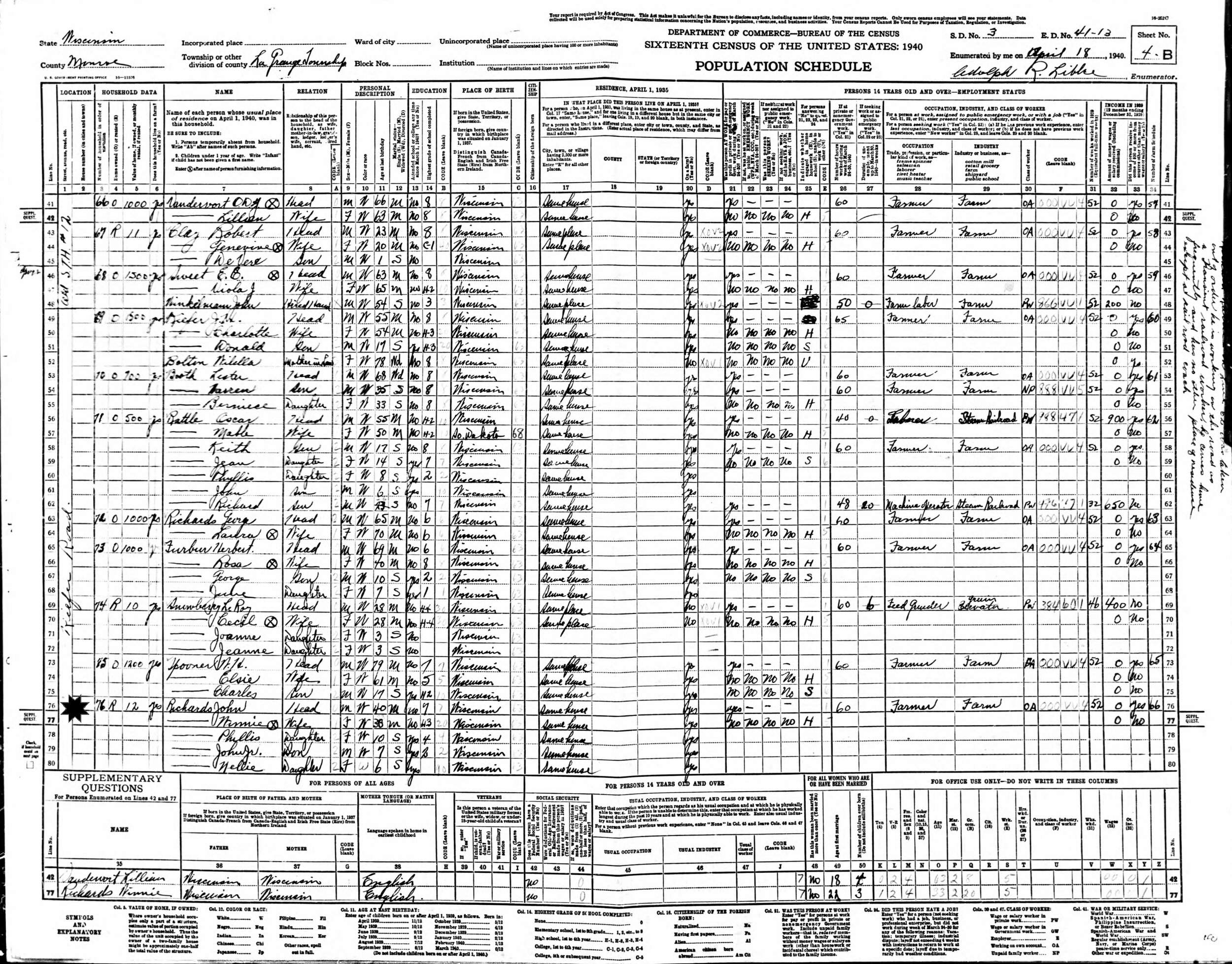 April 18, 1940 - Kiefer Road, Supervisor's District 3, Enumeration District 41-13, LaGrange Township, Monroe County, Wisconsin.