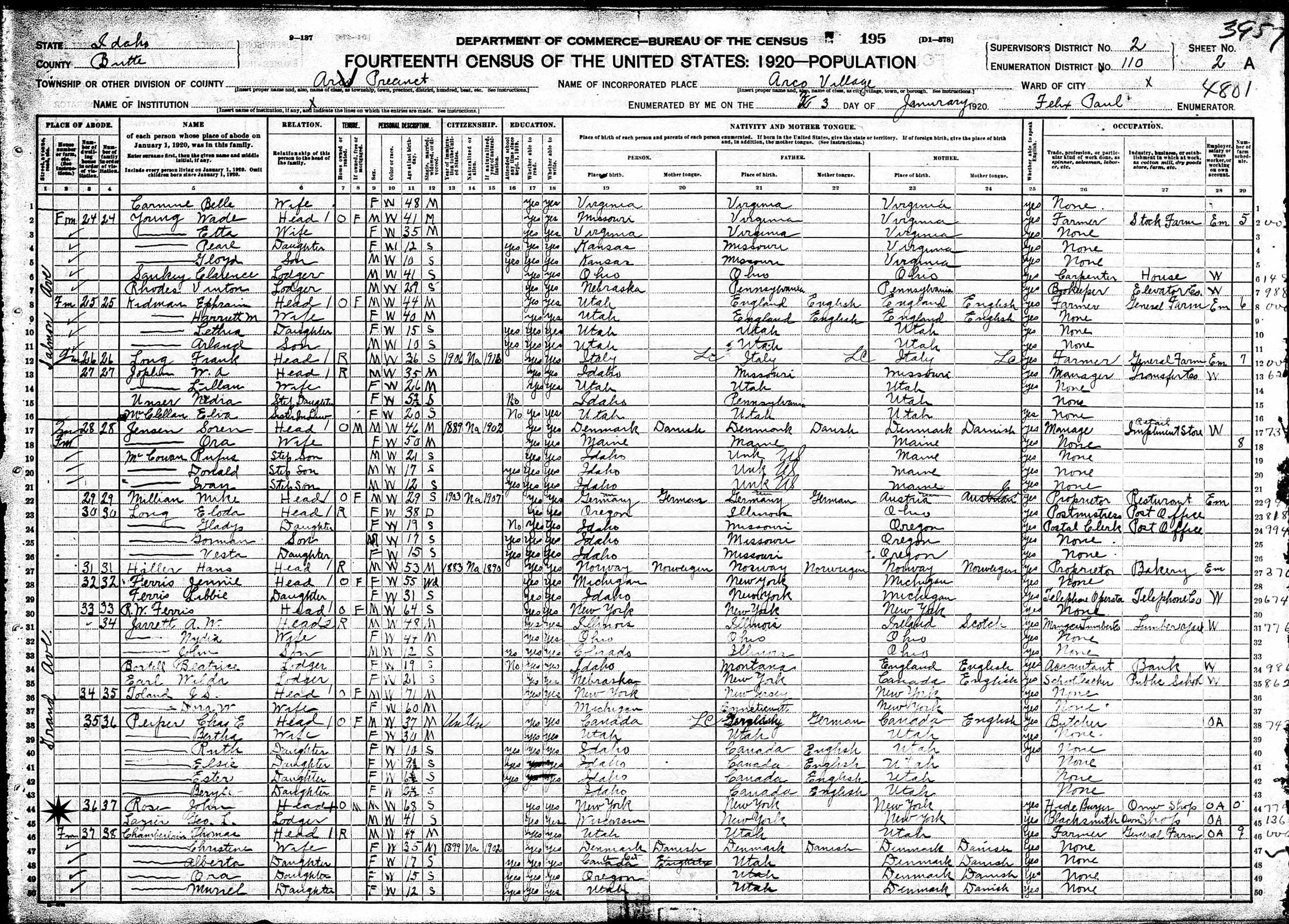 January 3, 1920 - Grand Avenue, Supervisor's District 2, Enumeration District 110, Arco Village, Butte County, Idaho.