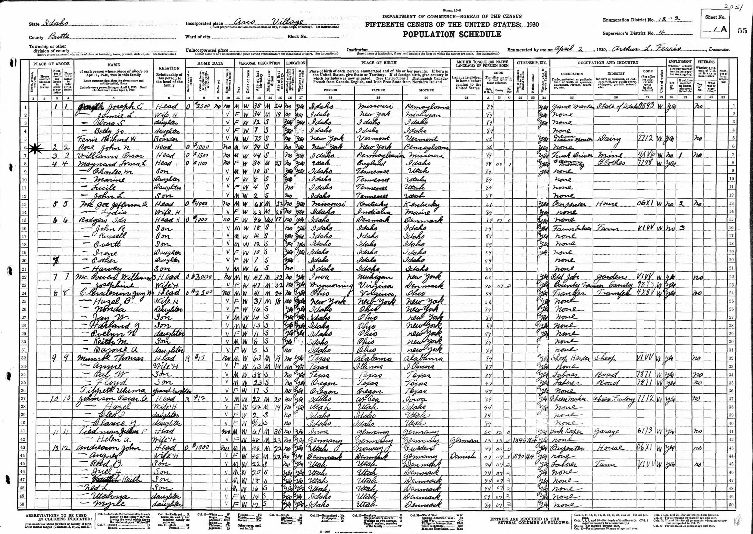 April 2, 1930 - Supervisor's District 4, Enumeration District 12-2, Arco Village, Butte County, Idaho.