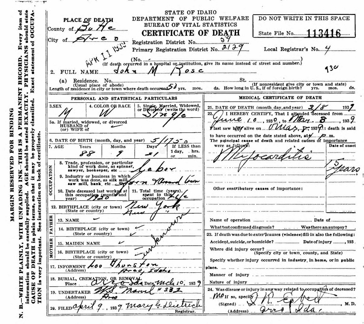 Died: March 8, 1939 in Arco, Butte County, Idaho. (Death Certificate: #113416.)