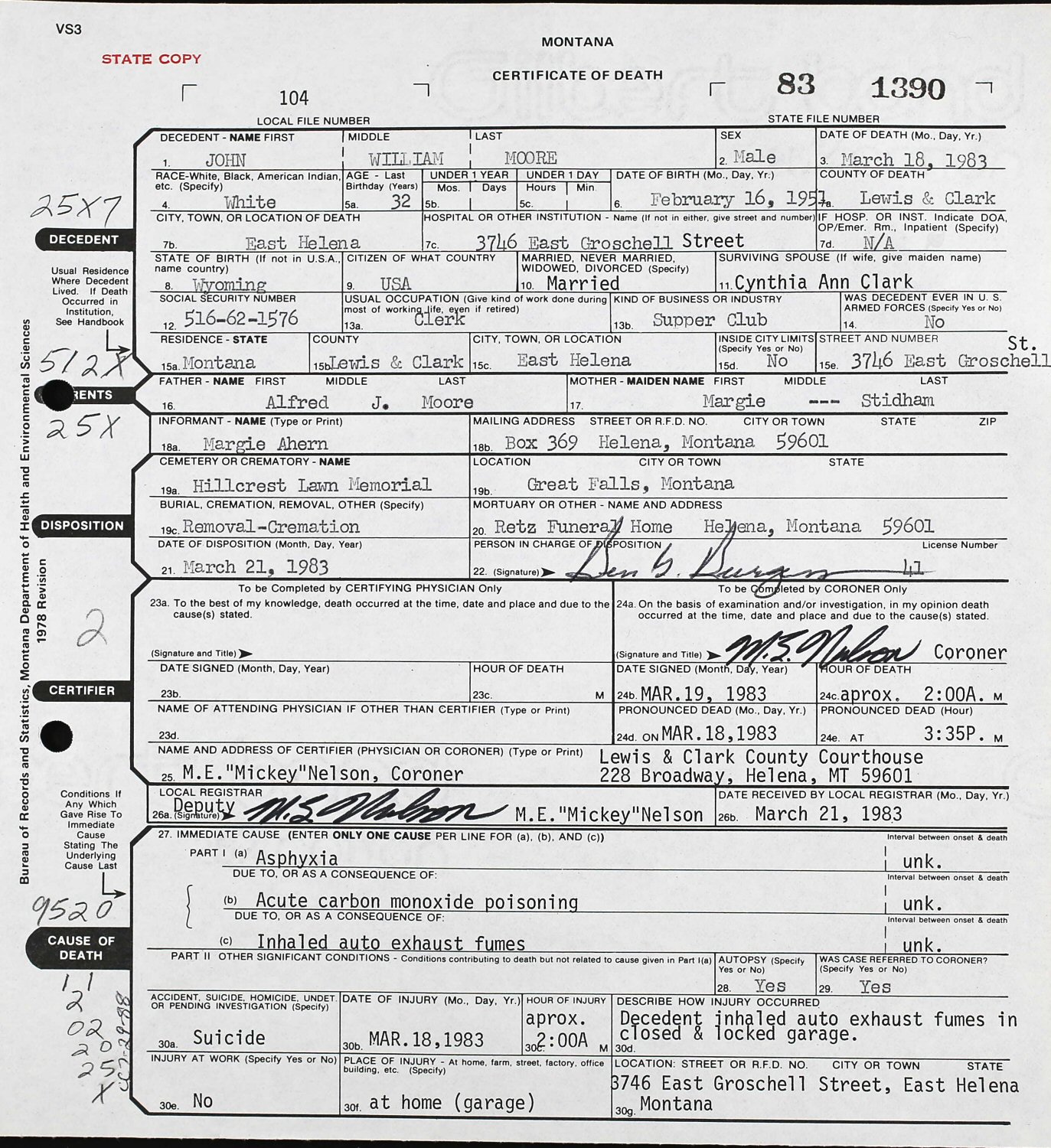 Cause of Death: Asphyxia, acute carbon monoxide poisoning, inhaled auto exhaust fumes - suicide.