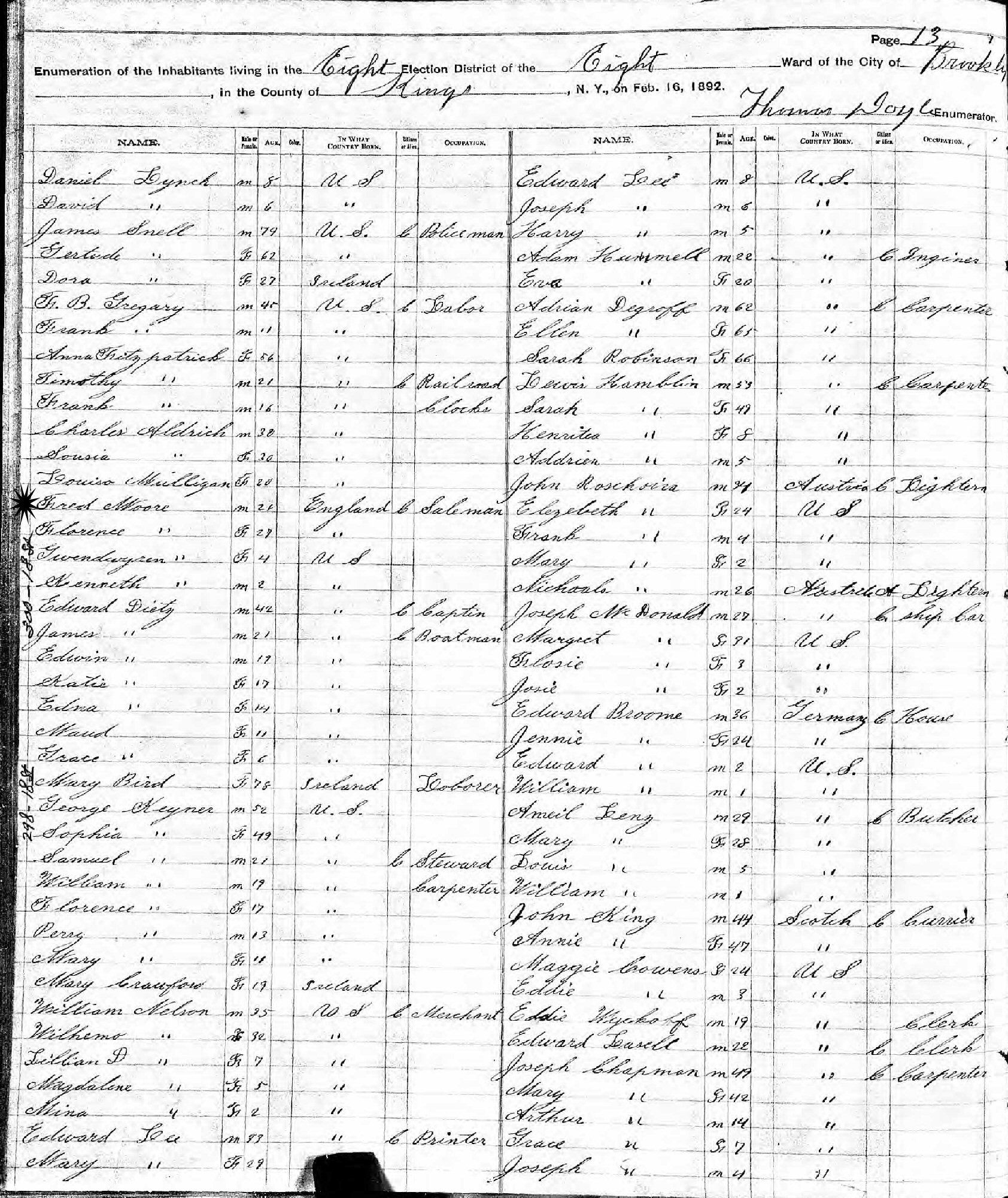 February 16, 1892 - New York State - 300 18th St, Election District 8, Ward 8, Brooklyn, Kings County, New York.