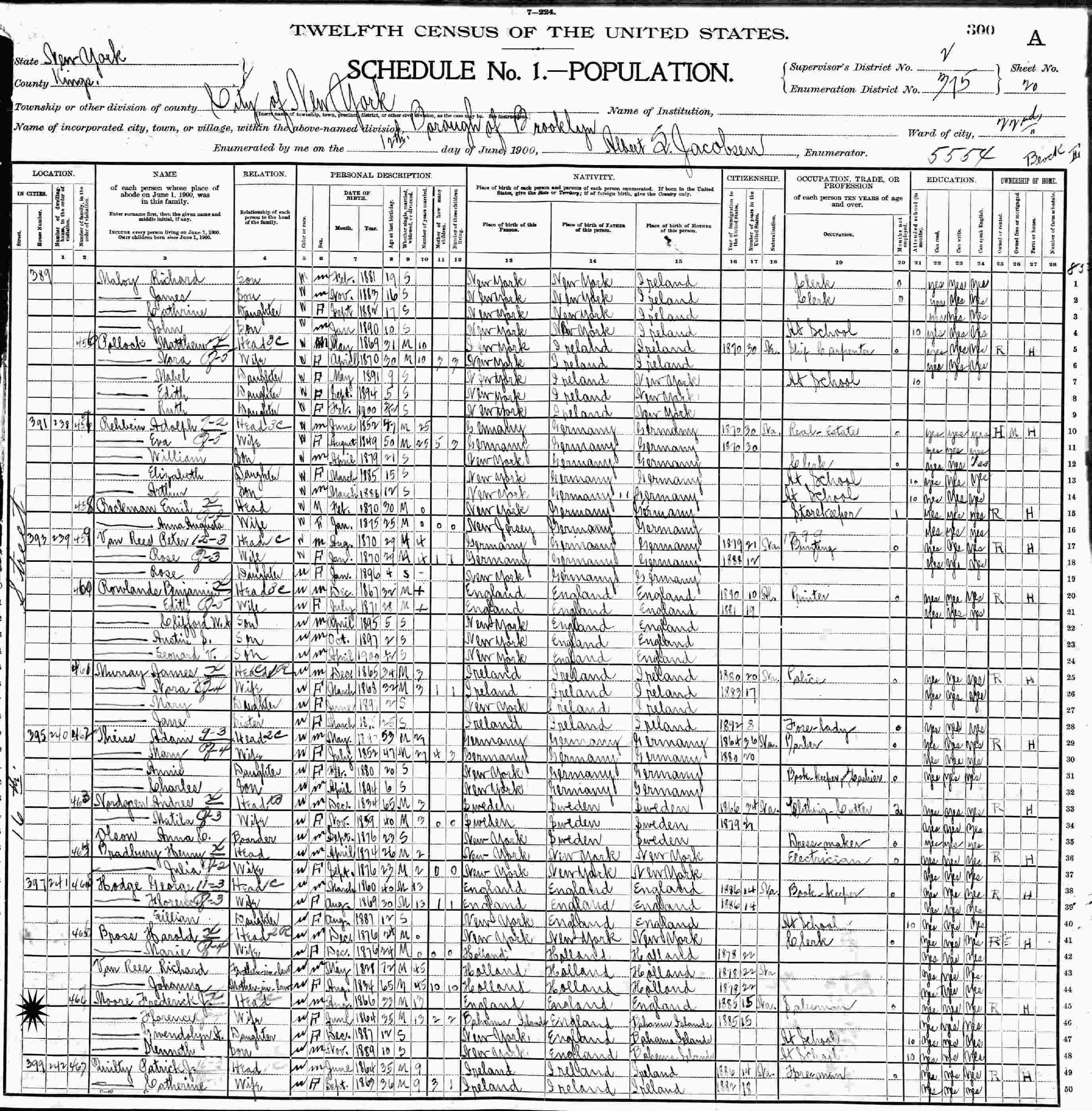 June 12, 1900 - 397 16th Street, Ward 22, Block E, Supervisor's District 2, Enumeration District 375, Brooklyn, Kings County, New York.