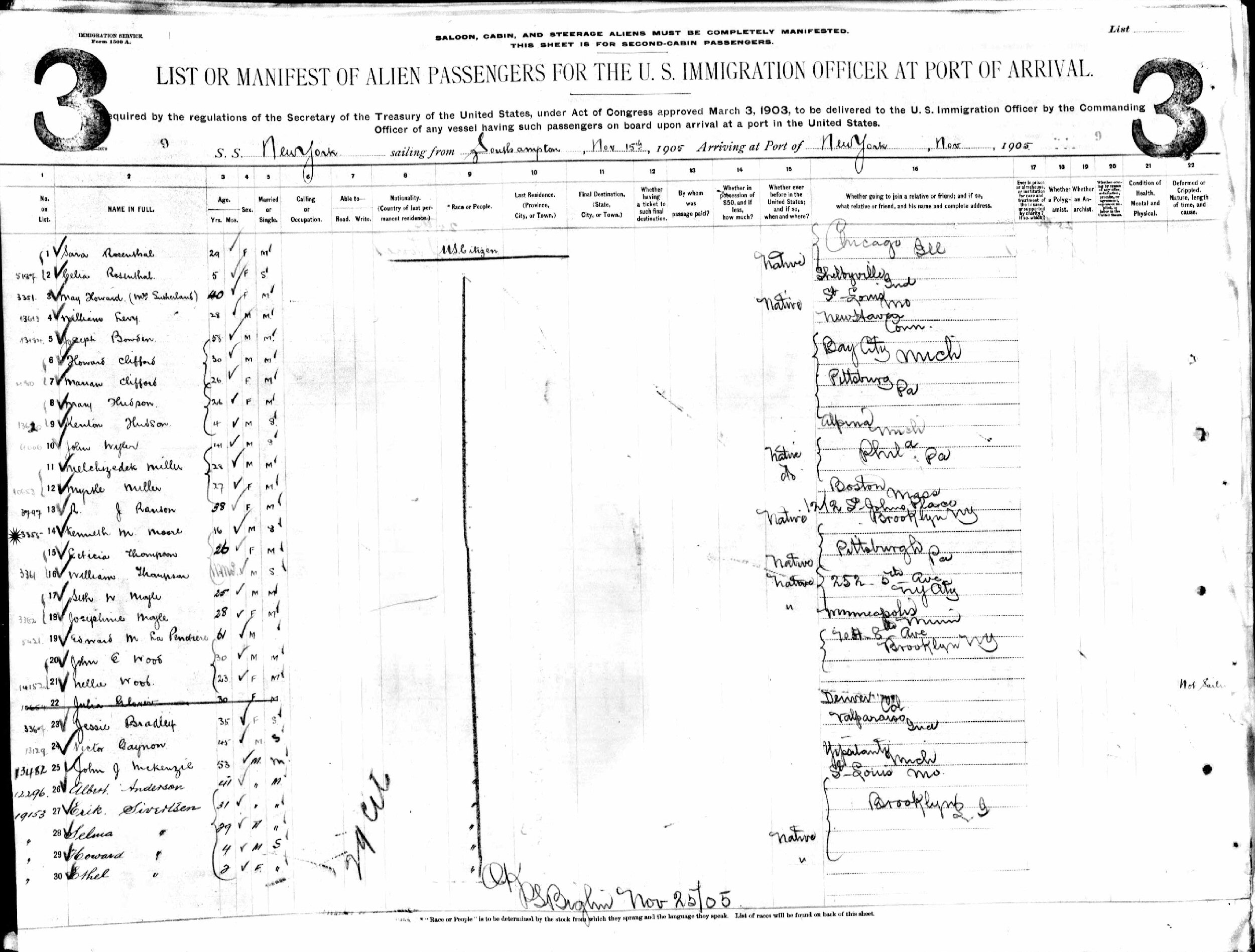 Travel: November 15, 1905 - S.S. New York sailing from Southampton to New York.