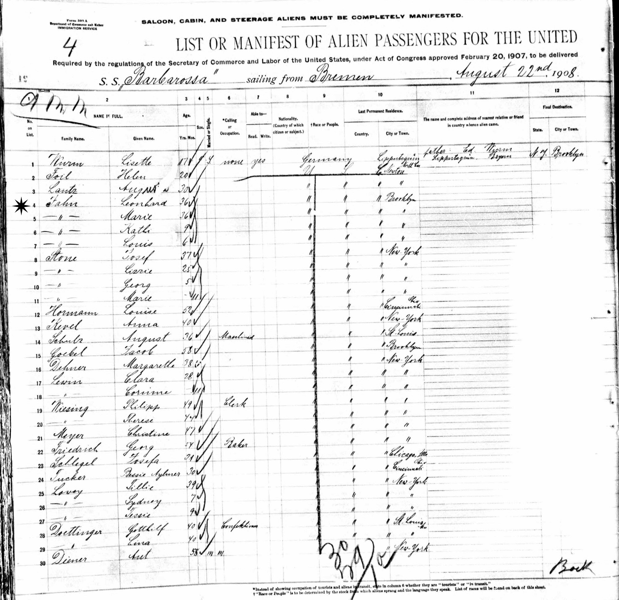 Travel: August 22-September 2, 1908 - Bremen, Germany to New York City, New York; Ship: SS Barbarossa.
