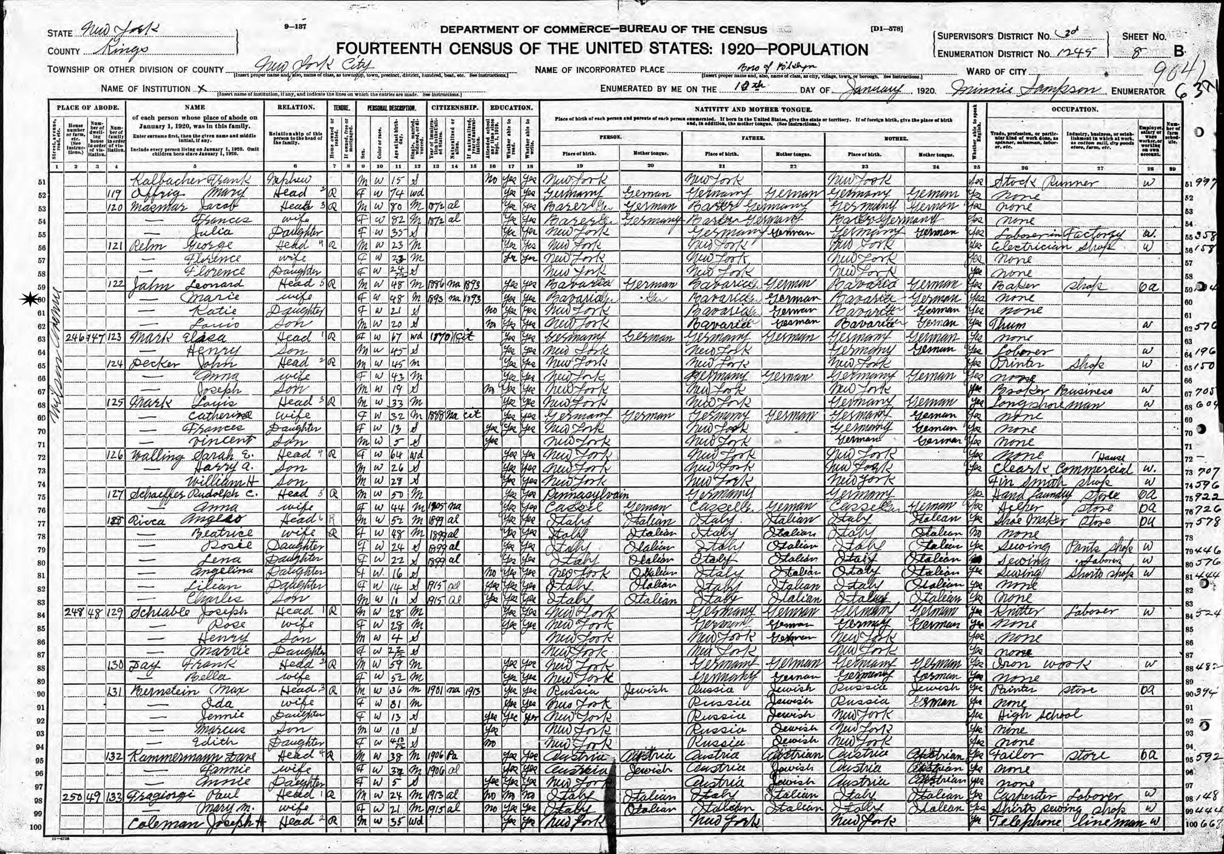 January 10, 1920 - 244 Wilson Avenue, Supervisor's District 3, Enumeration District 1245, Brooklyn, Kings County, New York.
