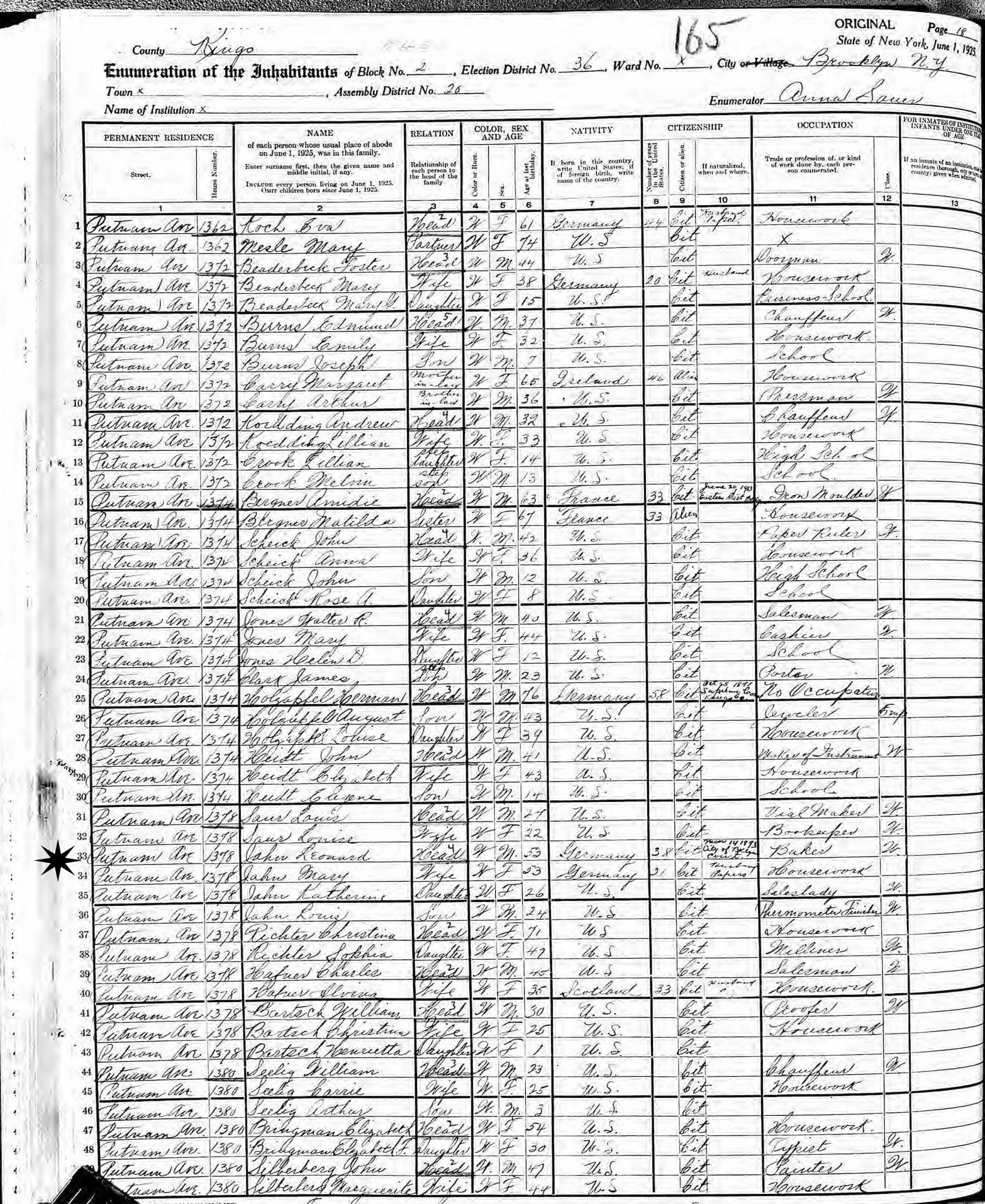 June 1, 1925 - New York State - 1378 Putnam Avenue, Block 2, Assembly District 20, Election District 36, Brooklyn, Kings County, New York.