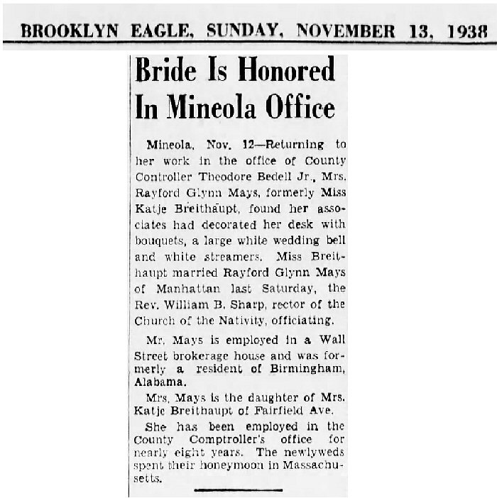 Married: Rayford Glynn Mays, Sr. November 5, 1938 in Church of the Nativity, (Episcopal) Mineola, Nassau County, New York. (Ceremony performed by Rev. William B Sharp. Marriage Certificate: #39868.)