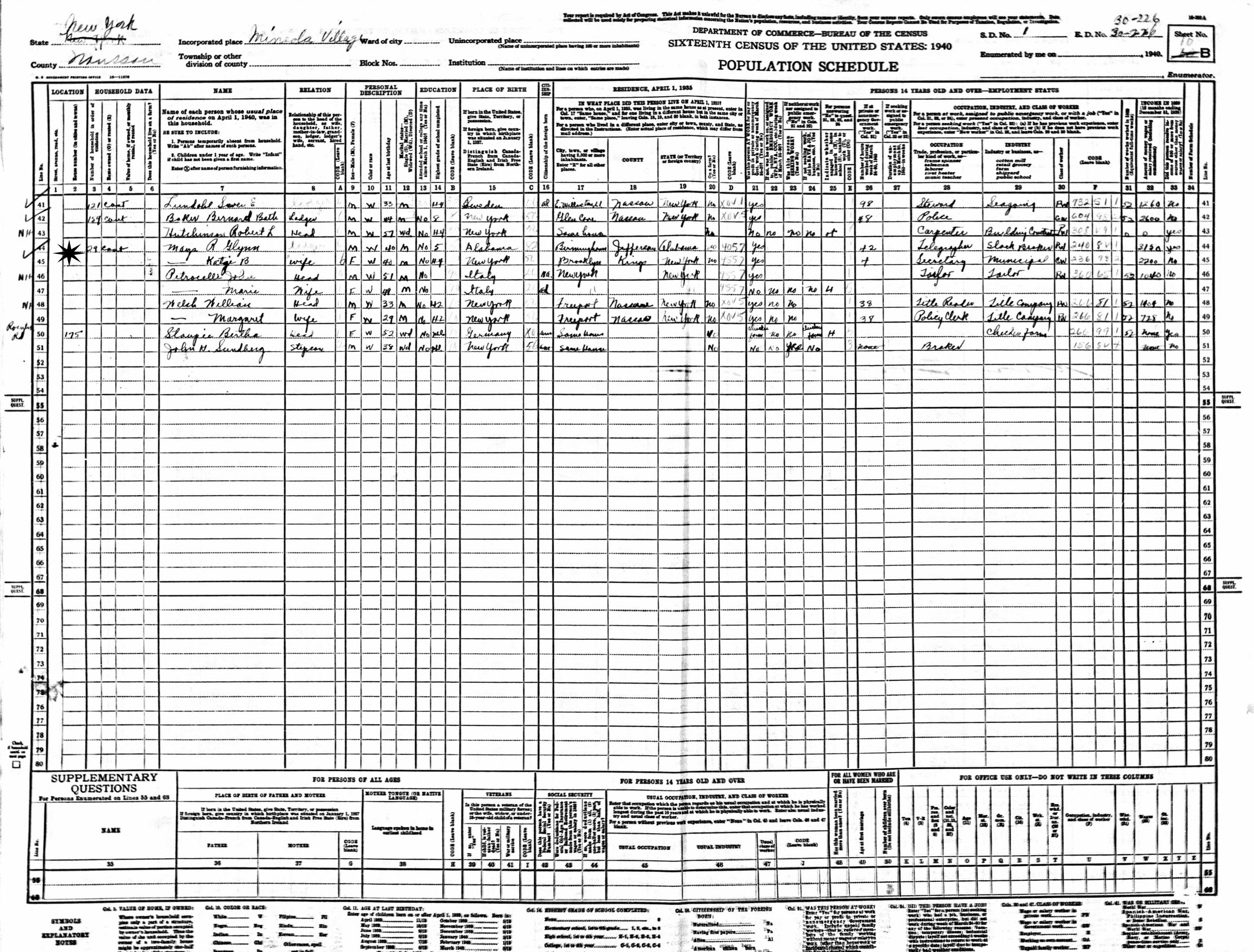 1940 - 185 Rossyln Road, Supervisor's District 1, Enumeration District 30-226, Mineola Village, Nassau County, New York.