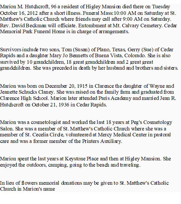 Notes for MARION M CLANEY HUTCHCROFT: