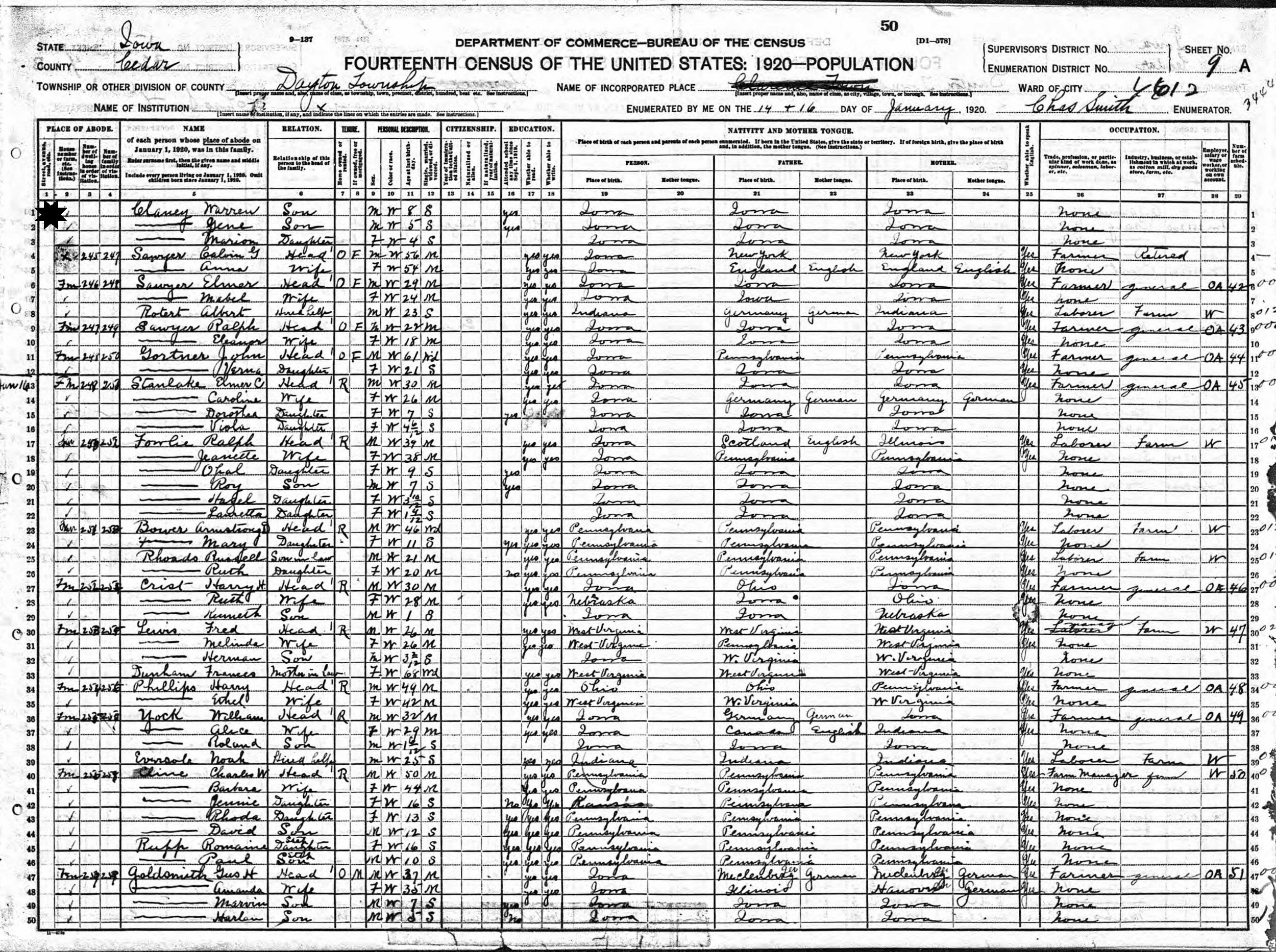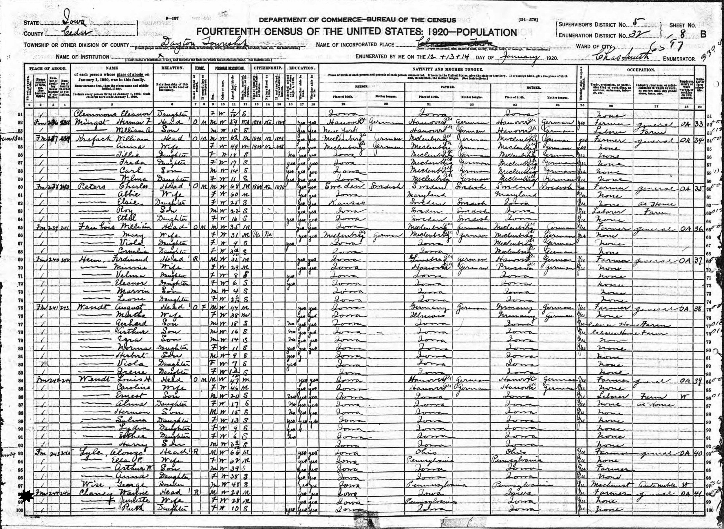 January 12-14, 1920 - Supervisor's District 5, Enumeration District 32, Dayton Township, Cedar County, Iowa.