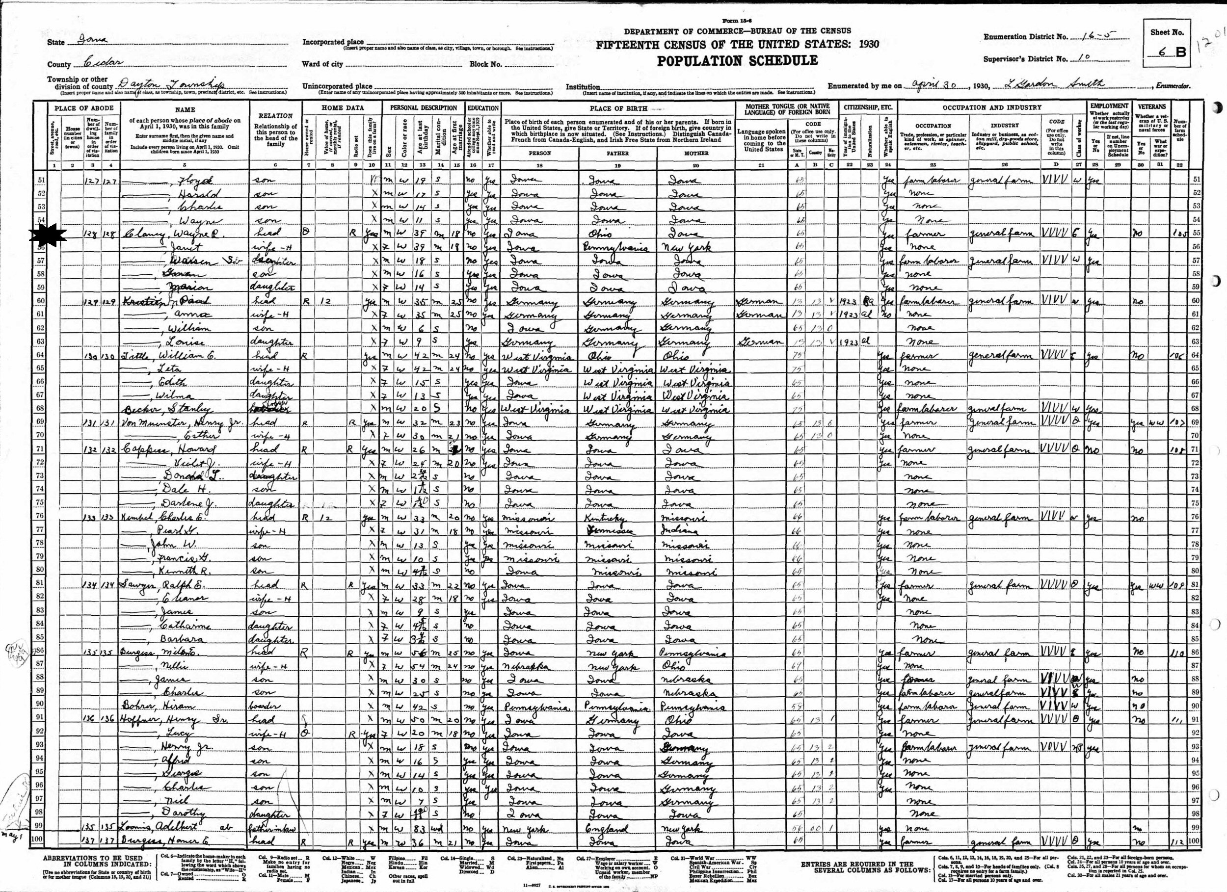 April 30, 1930 - Supervisor's District 10, Enumeration District 16-5, Dayton Township, Cedar County, Iowa.