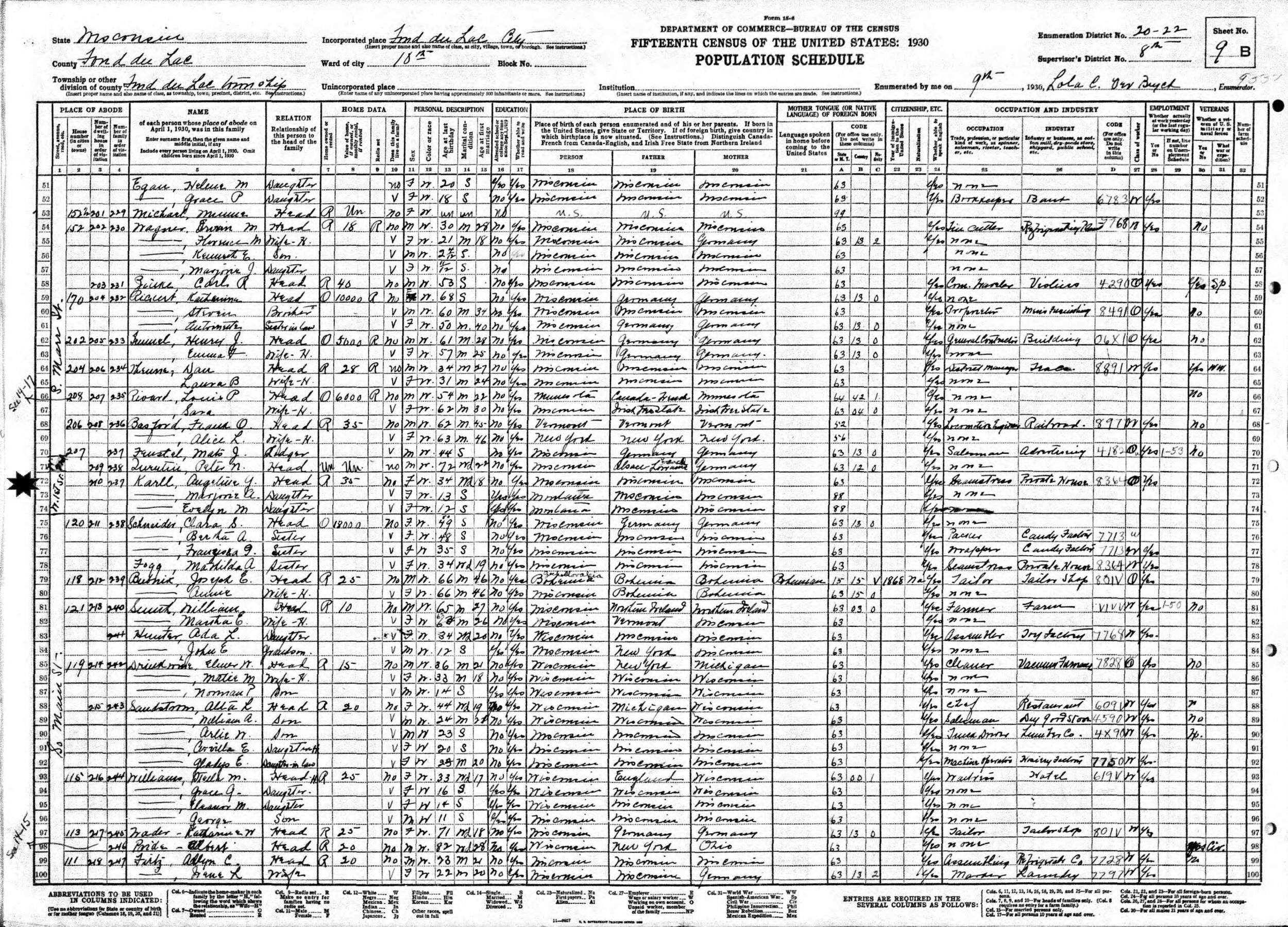 April 9, 1930 - 207 N 1st Street, Ward 18, Supervisor's District 8, Enumeration District 20-22, Fond Du Lac, Fond Du Lac County, Wisconsin.