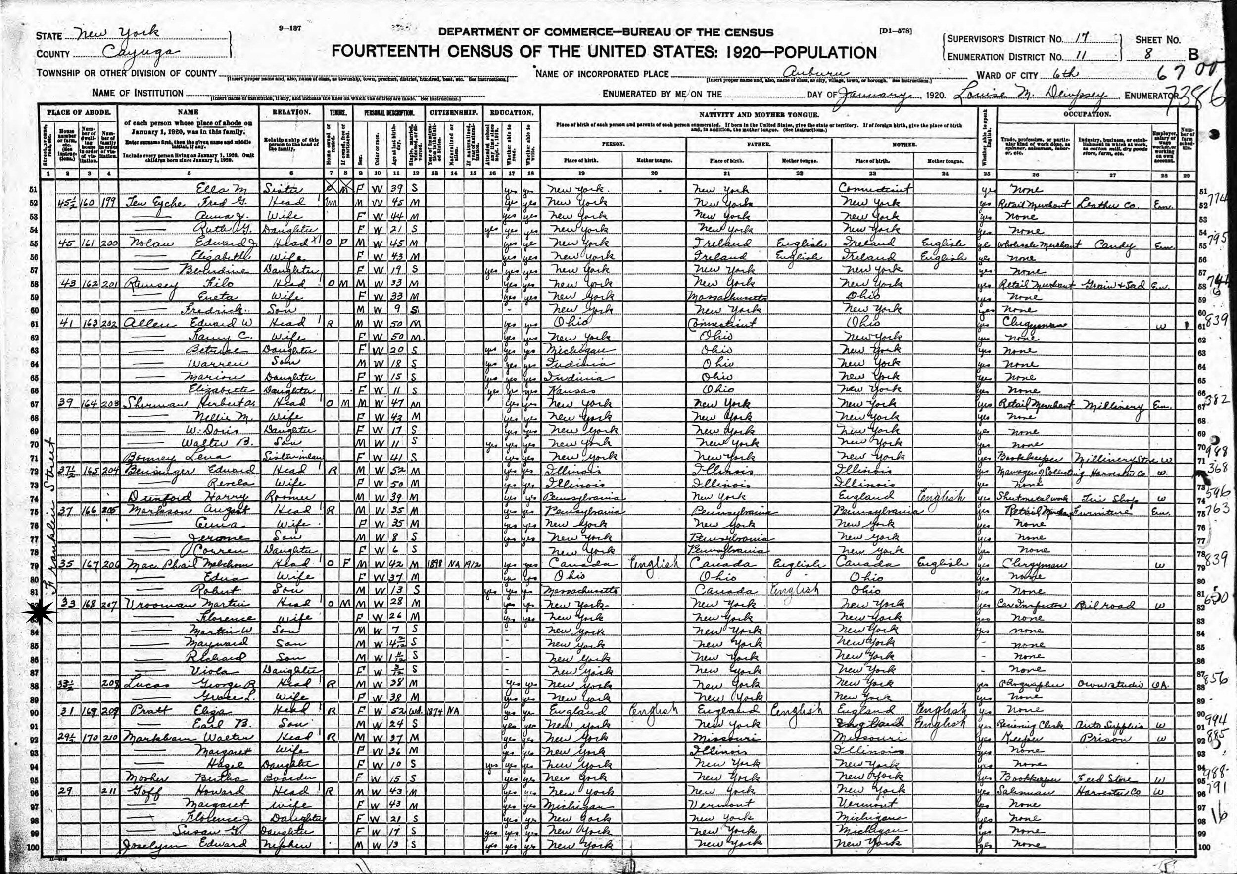January, 1920 - 33 Franklin Street, Ward 6, Supervisor's District 17, Enumeration District 11, Auburn, Cayuga County, New York.