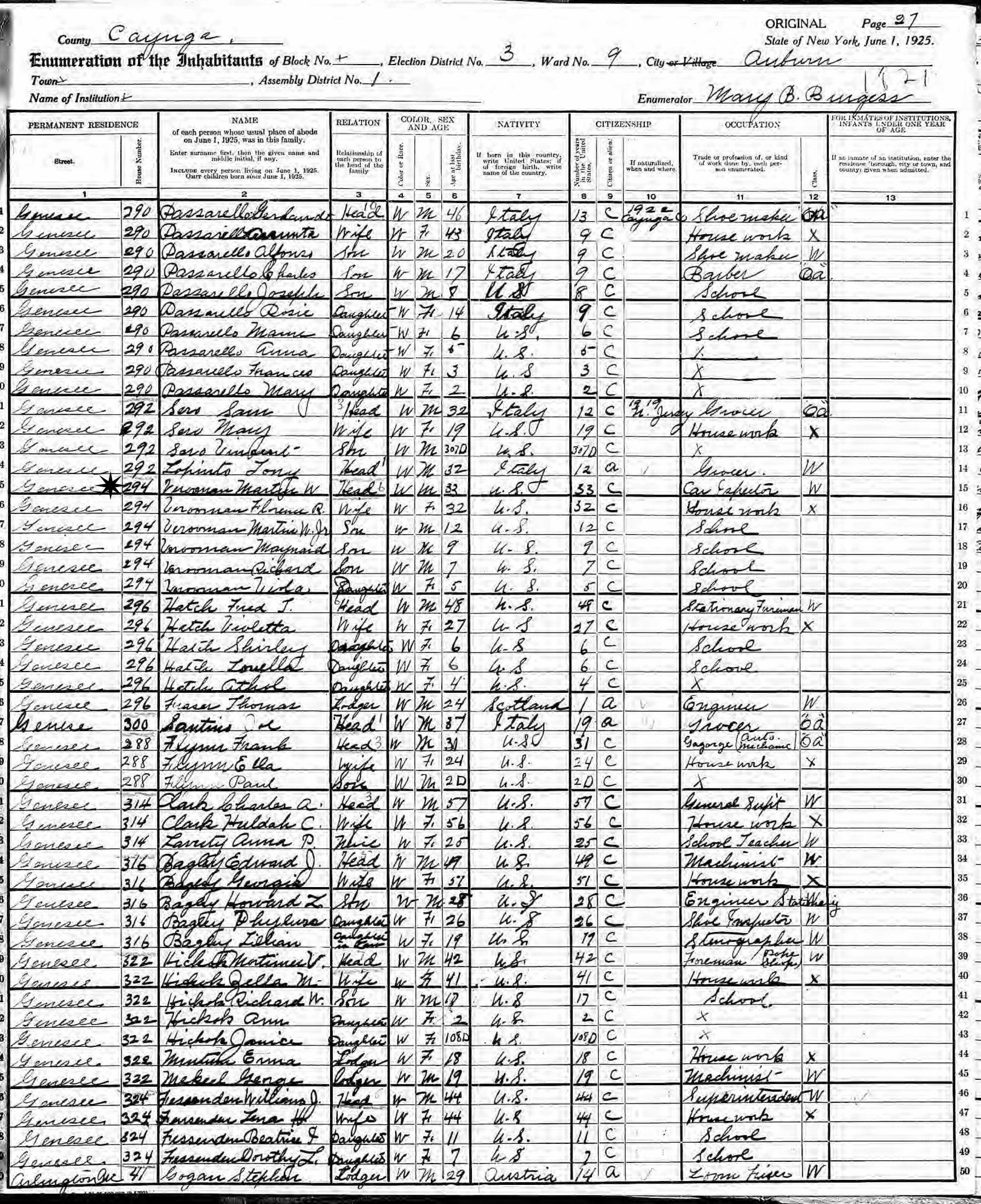 June 1, 1925 - New York State - 294 Genesee, Ward 9, Election District 3, Assembly District 1, Auburn, Cayuga County, New York.
