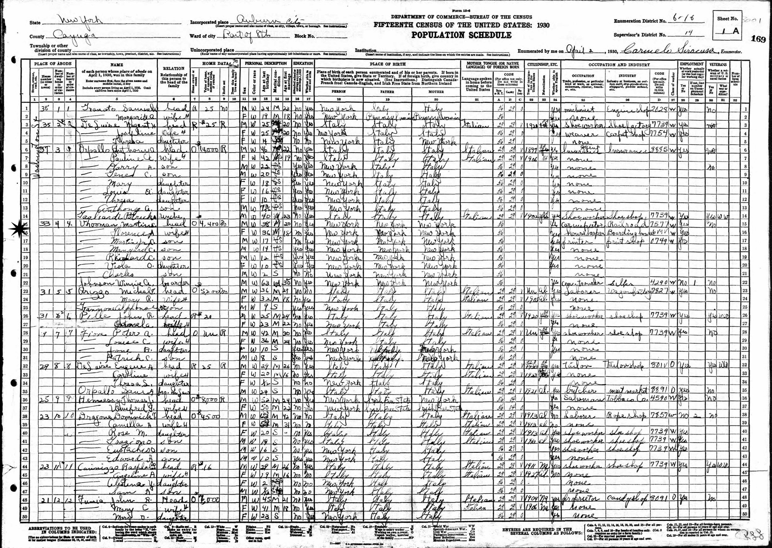 April 2, 1930 - 33 Washington Street, Ward 8, Supervisor's District 14, Enumeration District 6-16, Auburn, Cayuga County, New York.