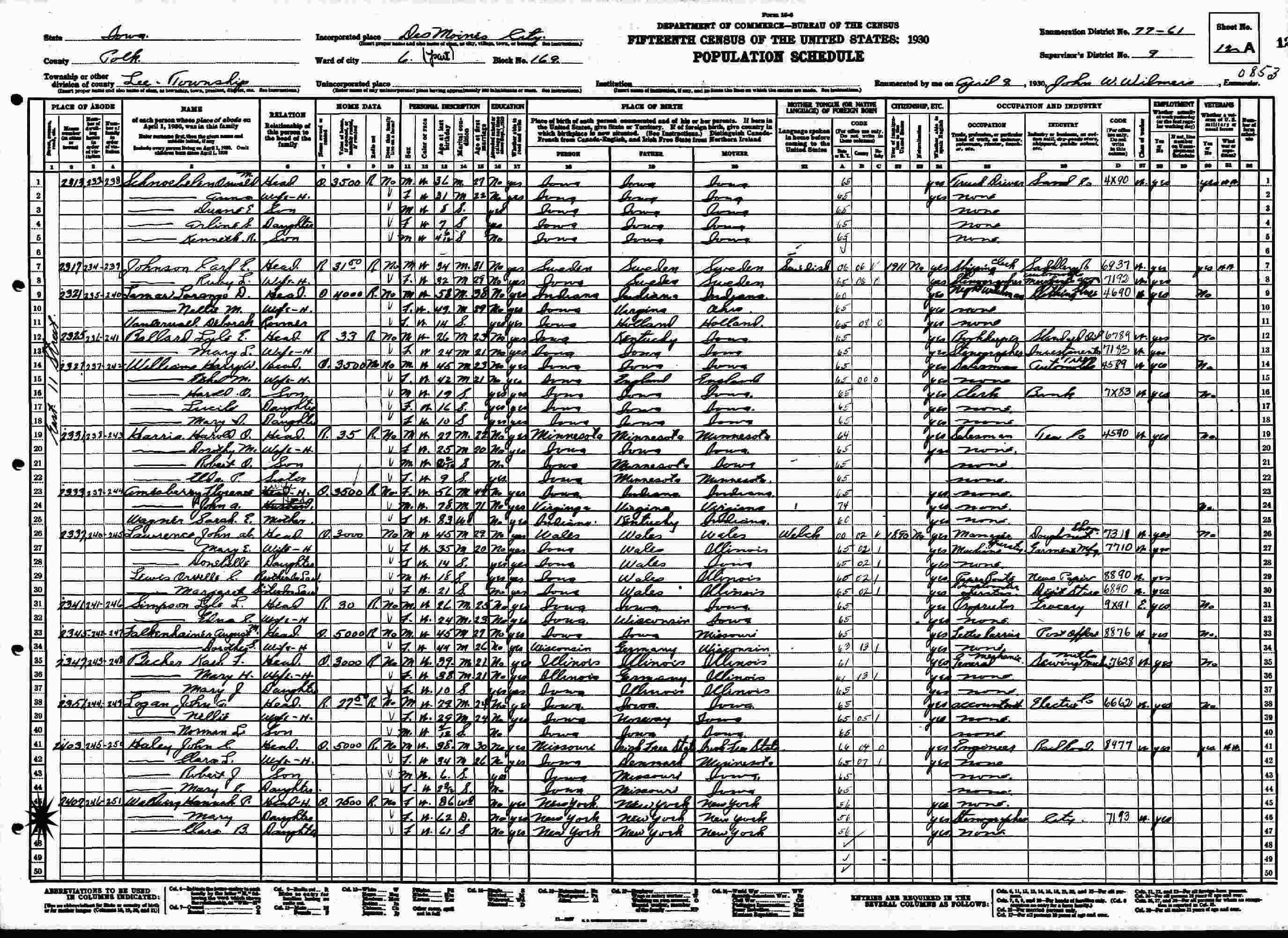 April 9, 1930 - 2407 East 11th Street, Ward 6, Block 169, Supervisor's District 9, Enumeration District 77-61, Des Moines, Polk County, Iowa.