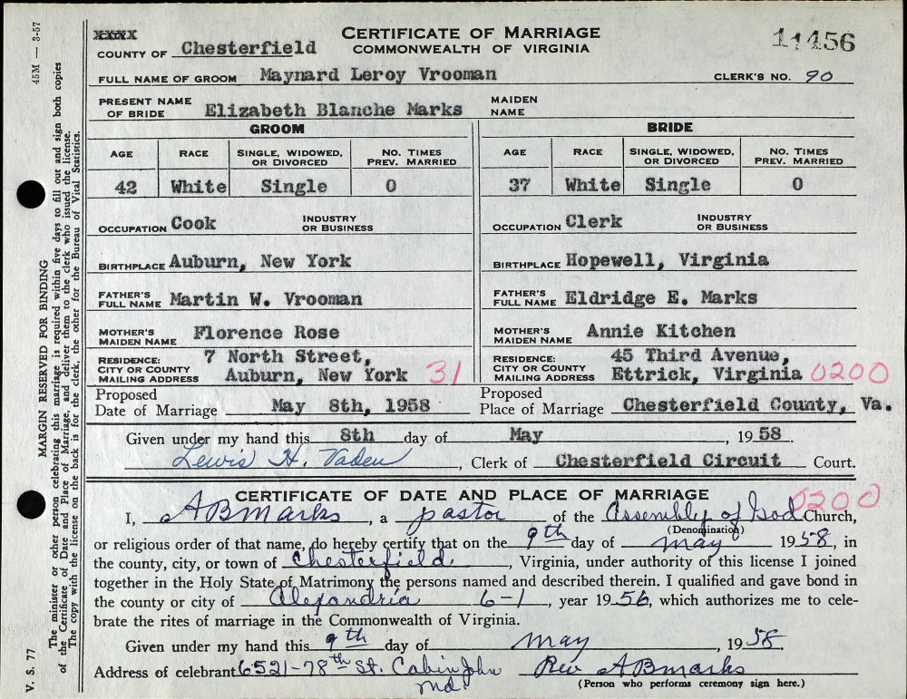 (2) Elizabeth Blanche Marks May 9, 1958 in Assembly of God Church, Chesterfield, Chesterfield County, Virginia.