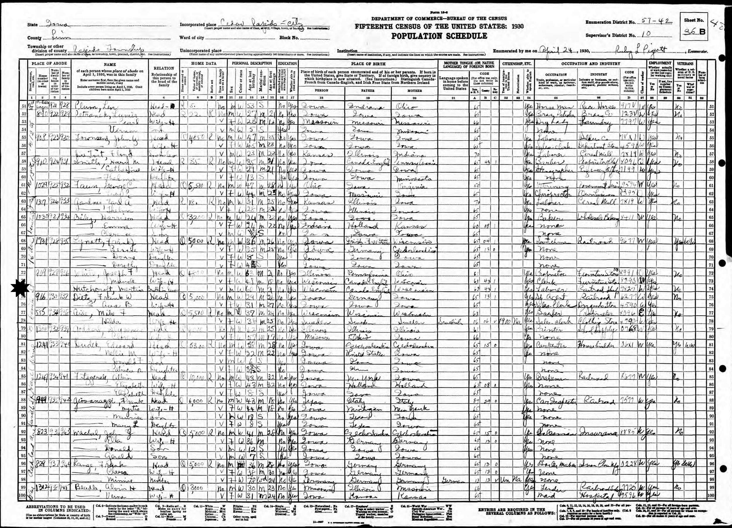 April 24, 1930 - 909 Daniels Street, Supervisor's District 10, Enumeration District 57-42, Rapids Township, Cedar Rapids, Linn County, Iowa (w/brother-in-law and sister, Joseph F and Maude White; listed as married but not with wife).