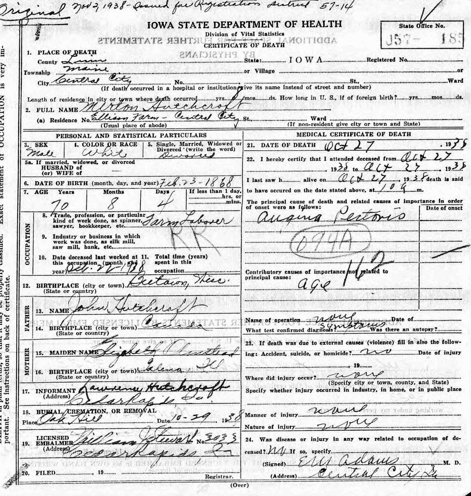 Died: October 27, 1938 in Maine Township, Central City, Linn County, Iowa. (Death Certificate: #57185.)