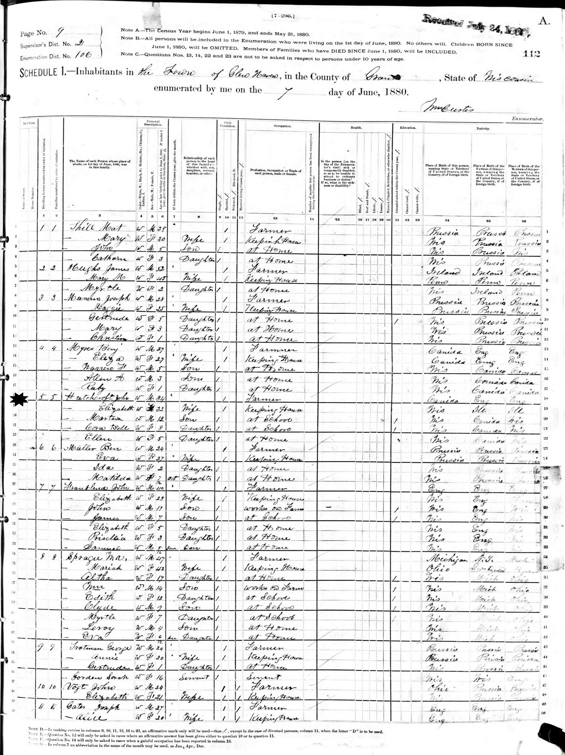 June 7, 1880 - Supervisor's District 2, Enumeration District 106, Glen Haven, Grant County, Wisconsin.