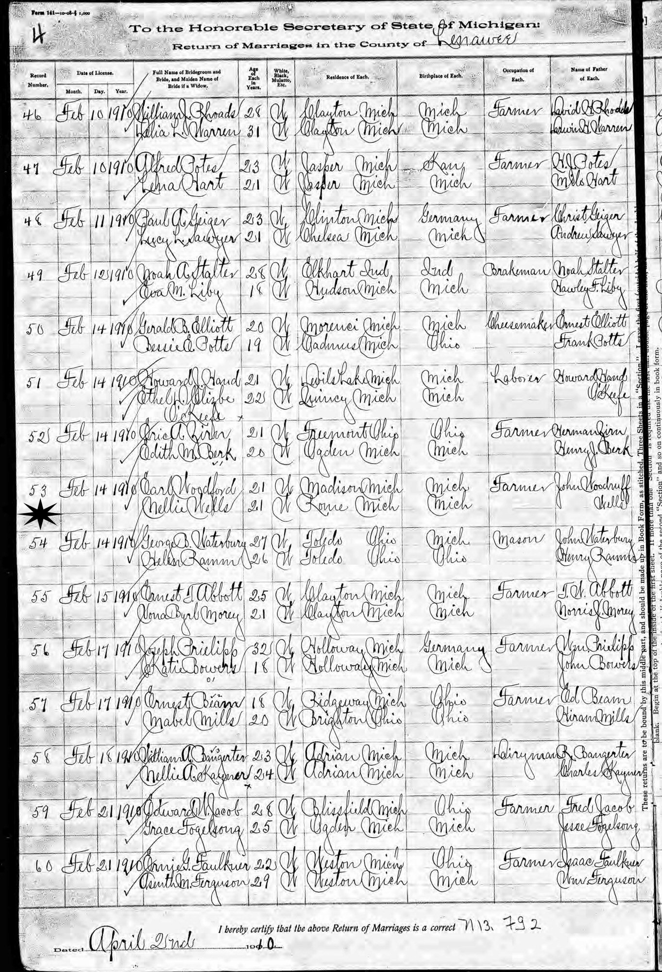 February 14, 1910 - Rome, Lenawee County, Michigan.