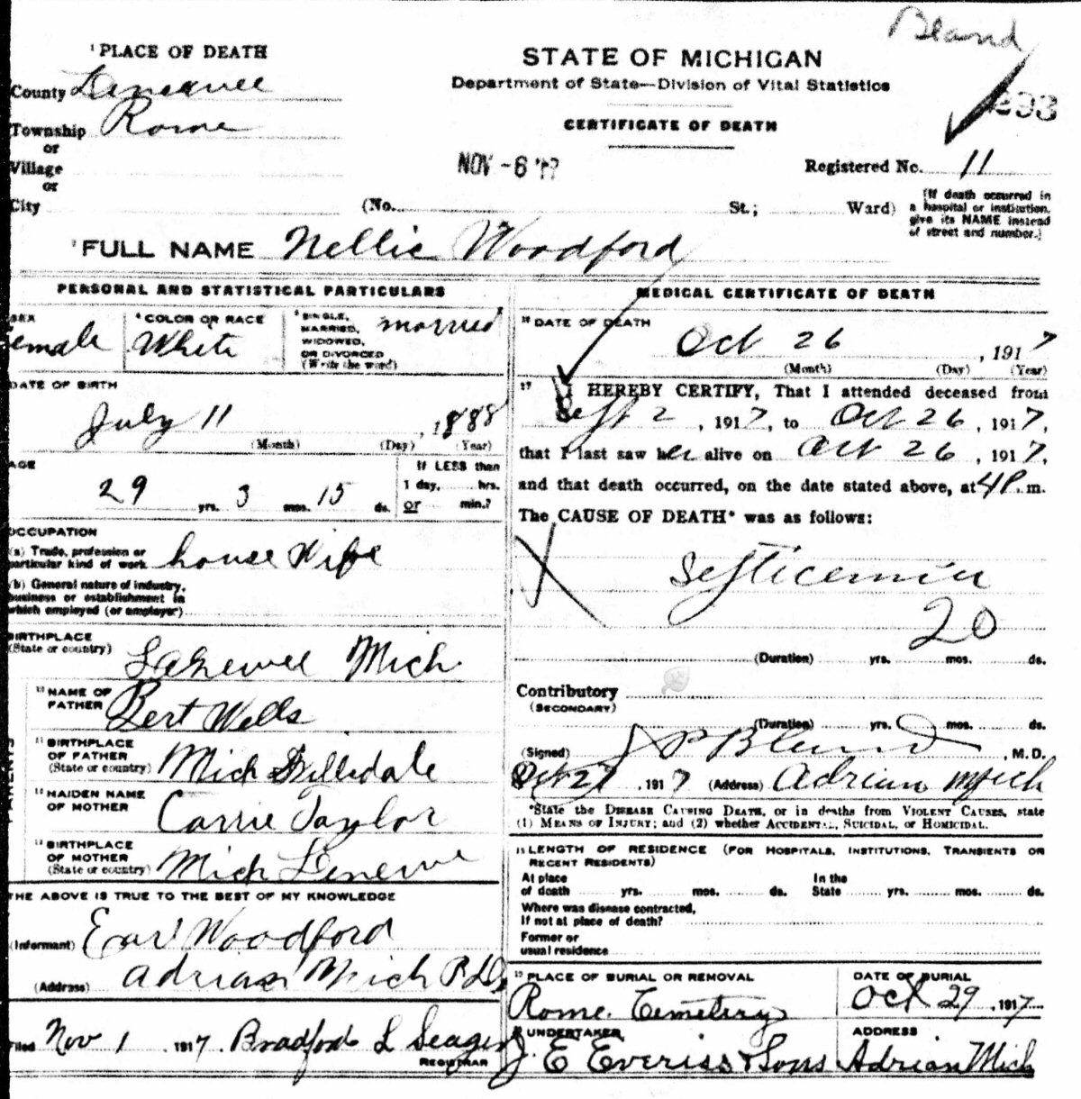 Buried: October 29, 1917 in Rome Center Cemetery, Rome, Lenawee County, Michigan.