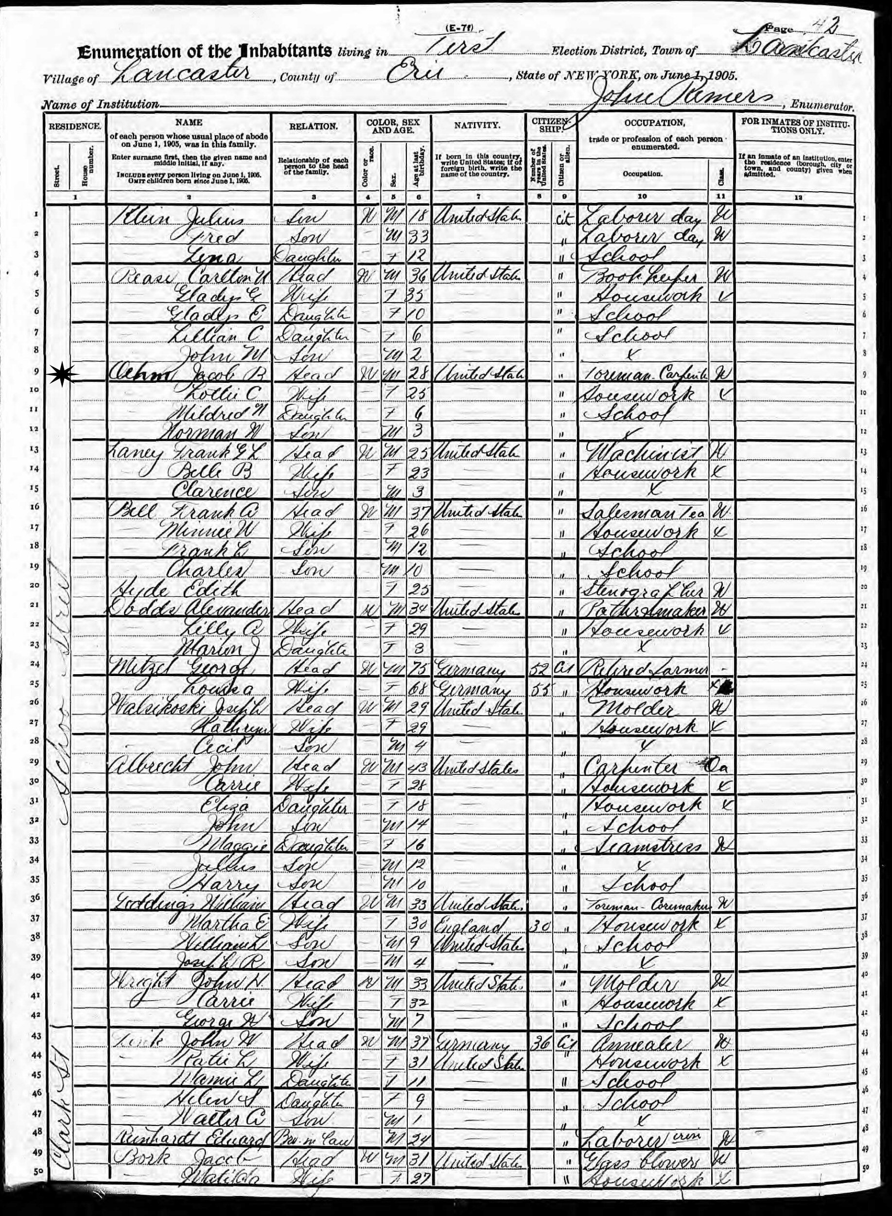 June 1, 1905 - New York State - Schoo Street, Election District 1, Lancaster, Erie County, New York.