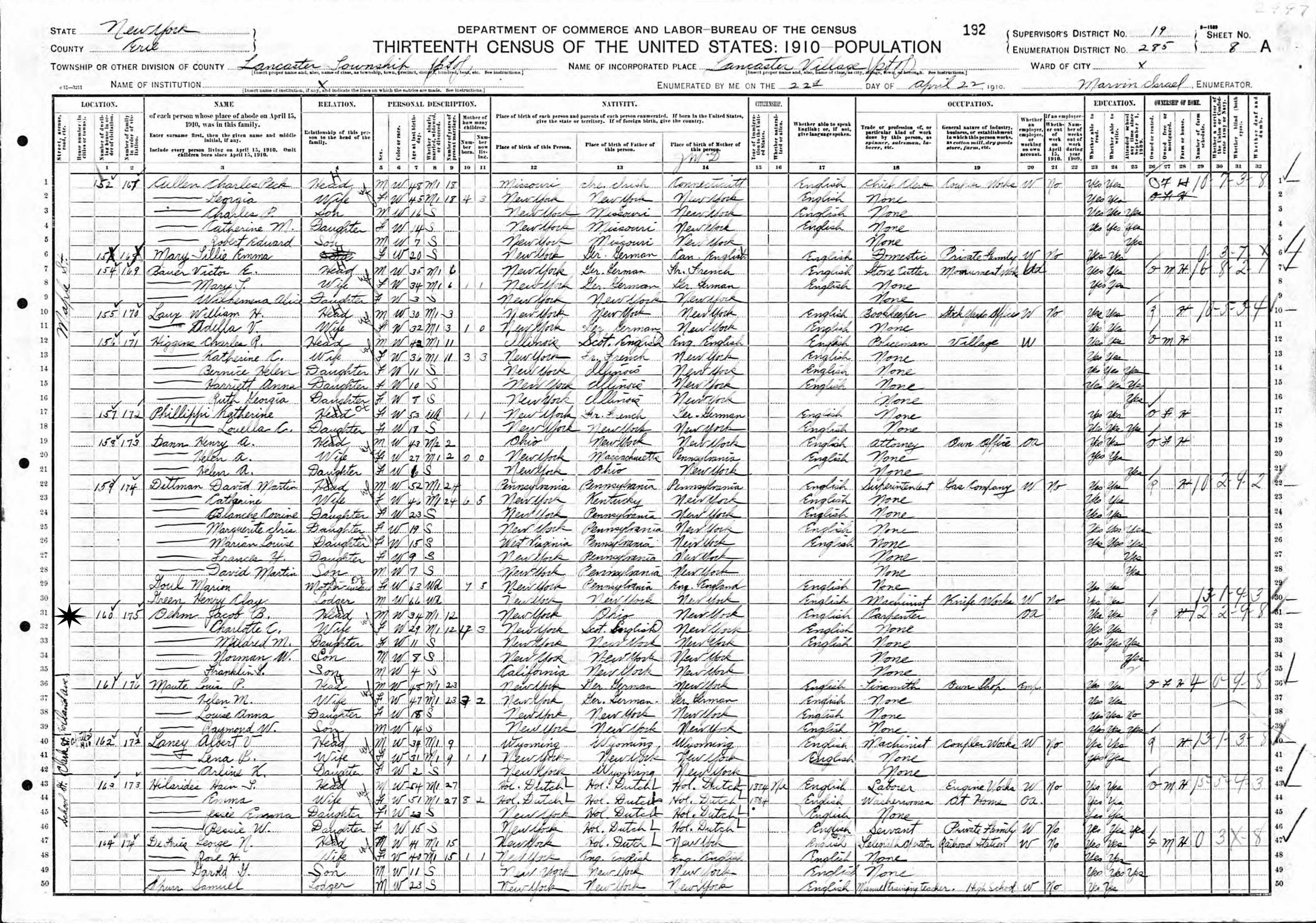 April 22, 1910 - Maple Street, Supervisor's District 19, Enumeration District 285, Lancaster, Erie County, New York.
